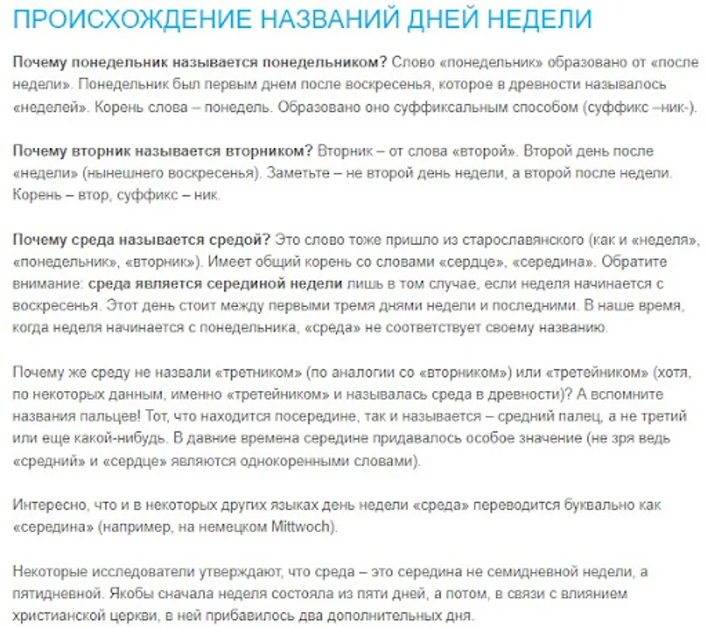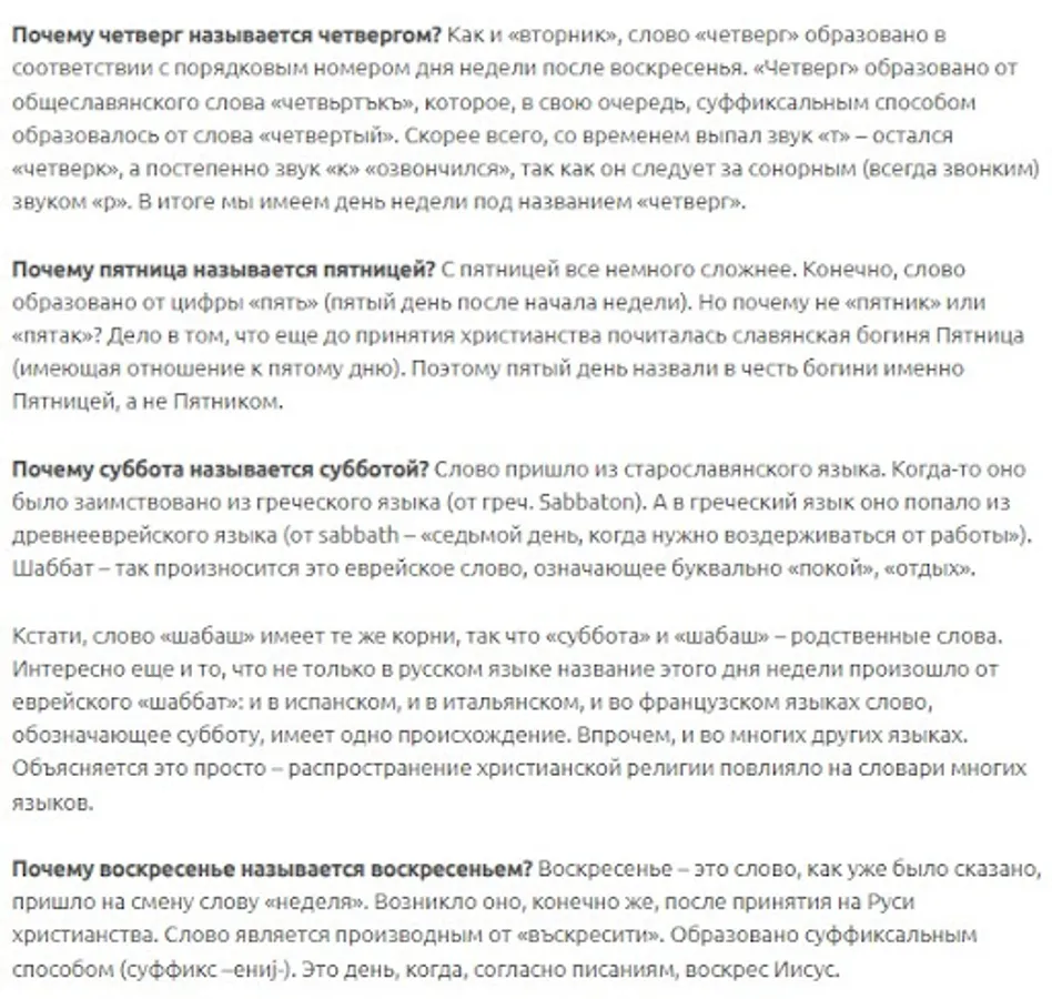 Соответствуют семи известным с древности небесным светилам: воскресенье — Солнцу, понедельник — Луне, вторник — Марсу, среда — Меркурию, четверг — Юпитеру, пятница — Венере и суббота — Сатурну. Семидневная неделя впервые была введена в странах Древнего Востока.
