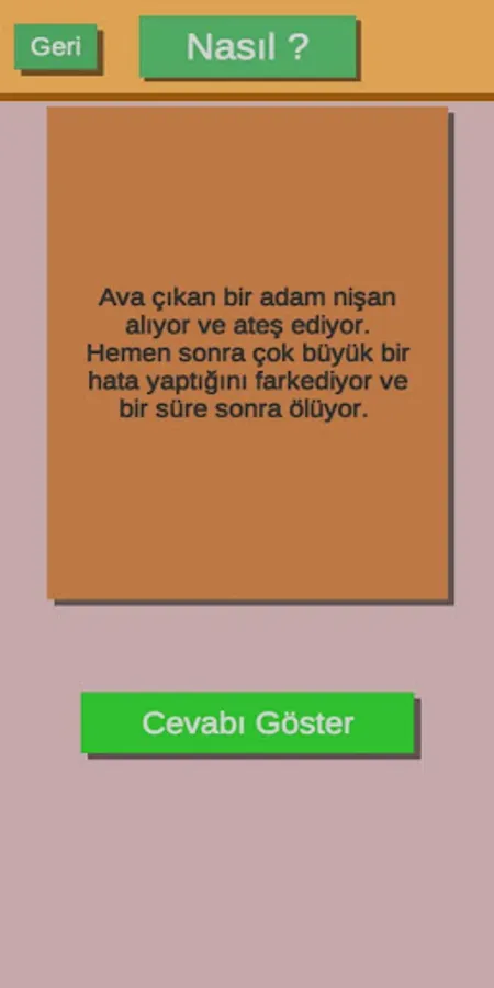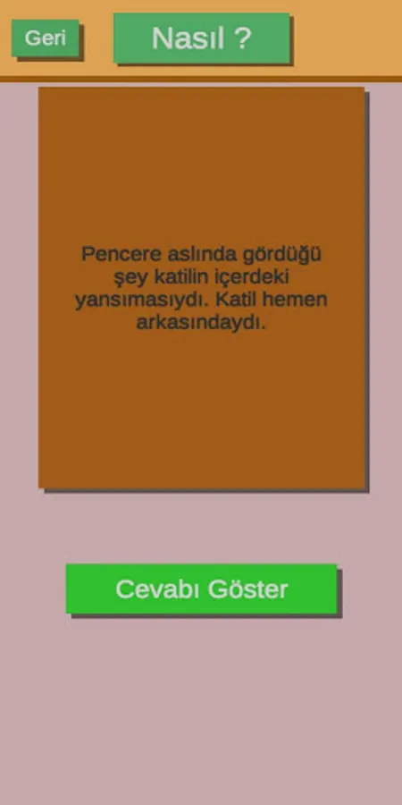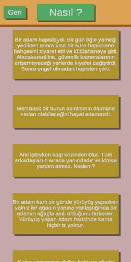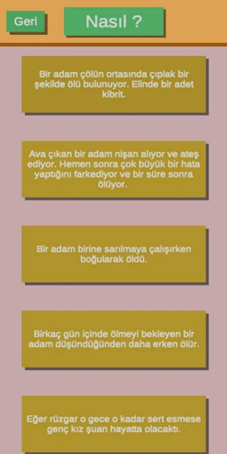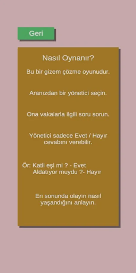 A killer game that you can play with your friends. Choose a manager among you and let him see how the incident happened. In the rest, the manager needs to ask questions about how the incident occurred. The manager can answer the questions only yes or no Example: Is the killer spouse? - Yes . Is the cause of death a heart attack? - No. Try to solve the event with questions such as. The more questions you ask, the closer you are to the result.