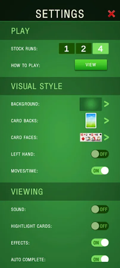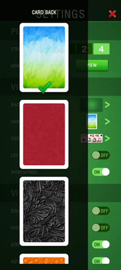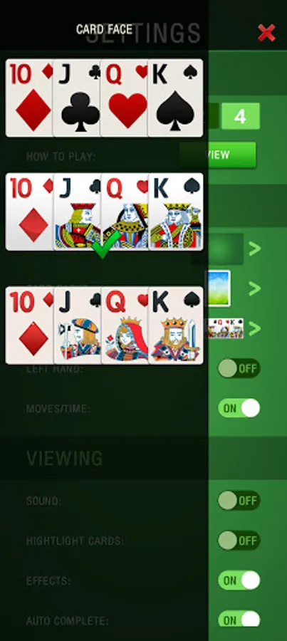 You can change the background, card backs, card faces, choose to play left hand, sound and many other options.