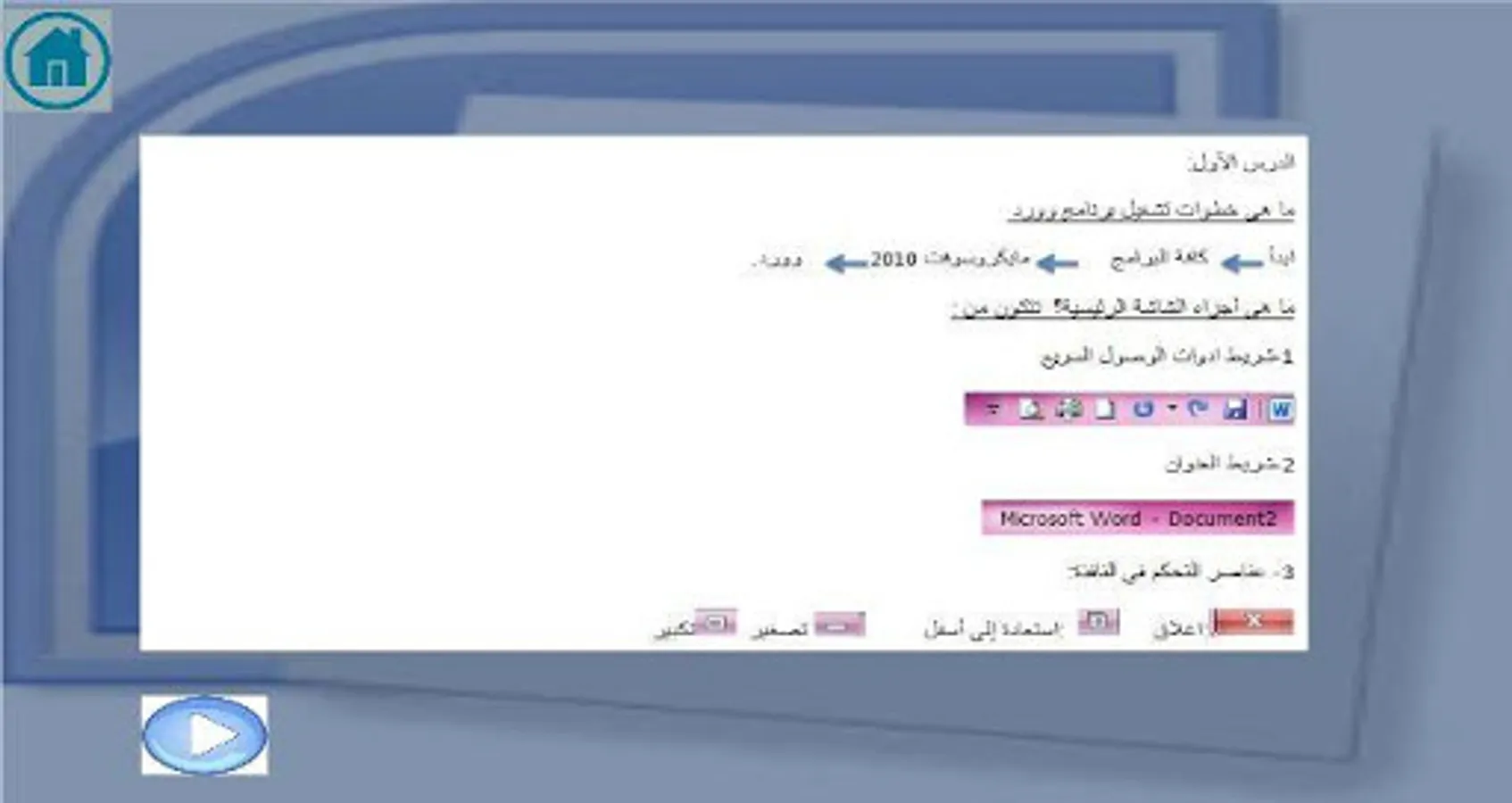 The aim is to learn the icons of word office, there is learn button contains simple lesson.