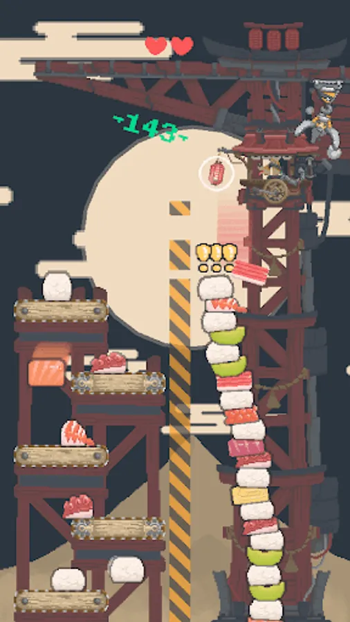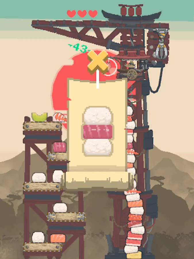 Stack sushi perfectly, don’t miss any placement and when you get a streak of three perfect pieces, you'll activate the fever mode, changing the claw for a sushi cannon with which pieces fall non-stop at a frantic rate in a shooter mini game.