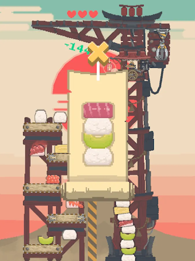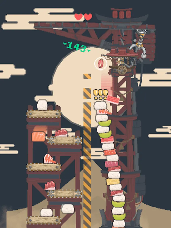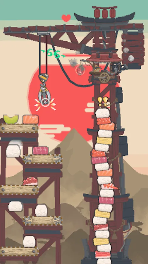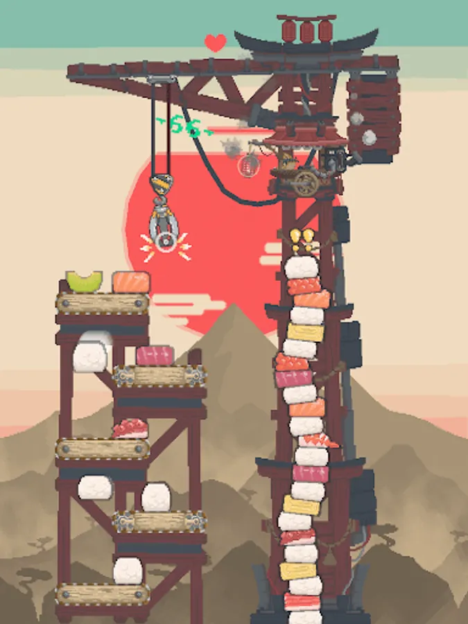 Rising Sushi is a fast paced arcade with easy and intuitive one touch controls where your skill to grab and drop giant pieces of sushi with a claw in the right moment and order is key to assemble an endless tower and score points.