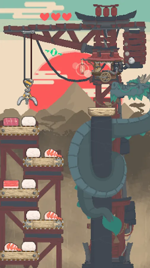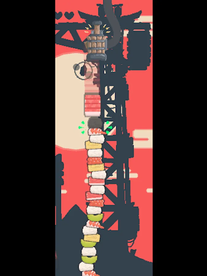 Rising Sushi - Free is a fast paced arcade with easy and intuitive one touch controls where your skill to grab and drop giant pieces of sushi with a claw in the right moment and order is key to assemble an endless tower and score points.