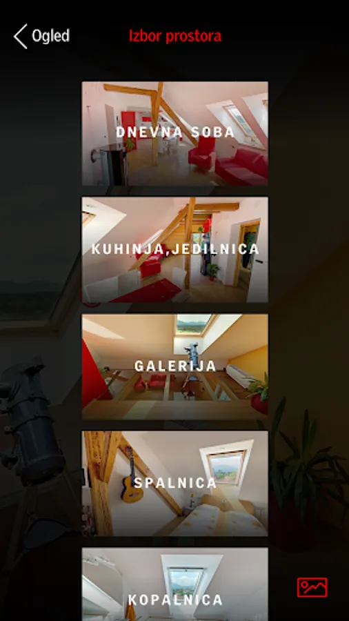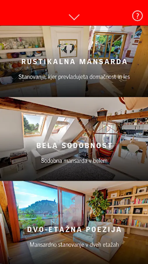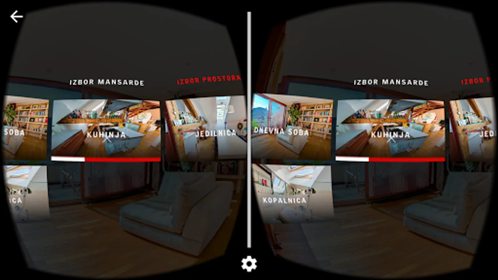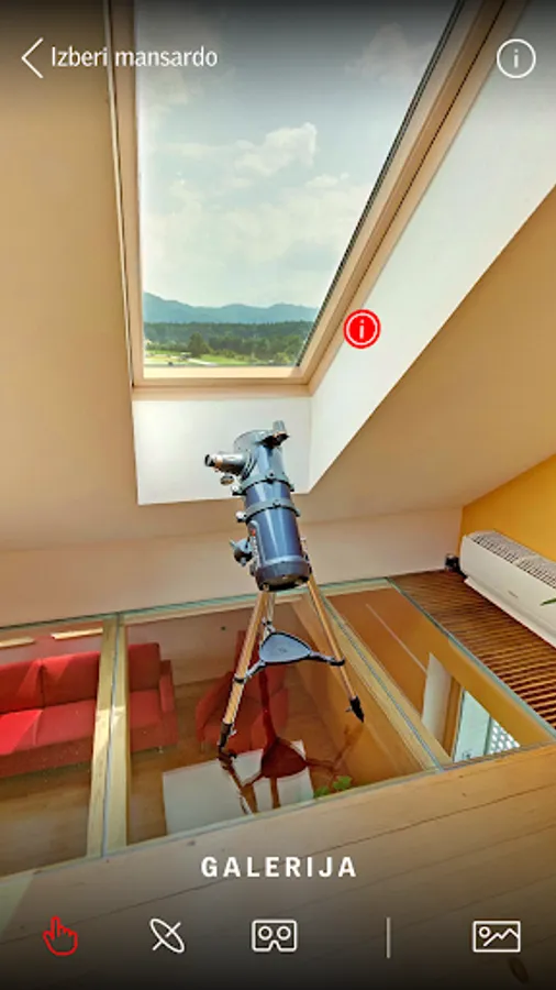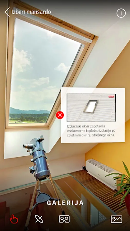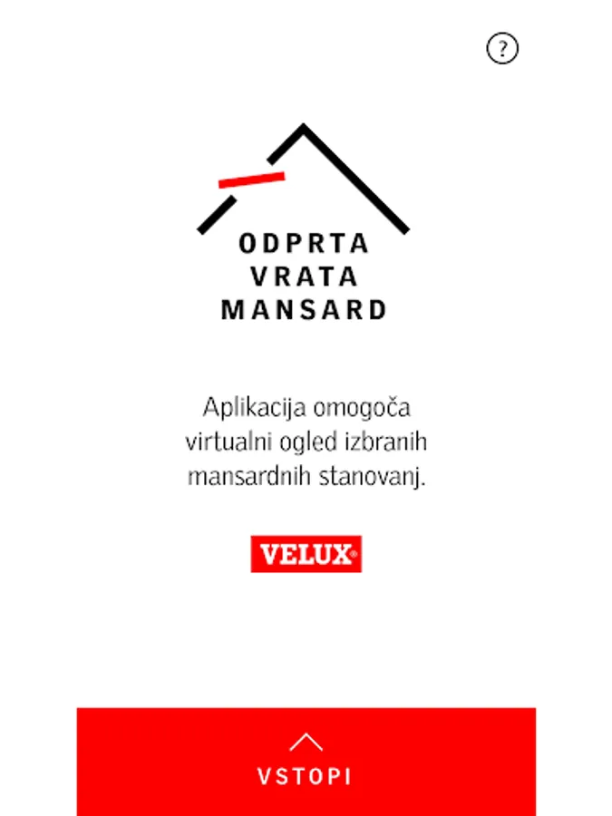 Over the premises in the attic with the help of your phone. For a unique user experience Order 3D glasses for free at veux@velux.si. The application allows a walk after 4 flats: select a mansard roof and see the living room, bathroom, children's room, kitchen or bedroom. Complete VR experience for future housing arrangements.