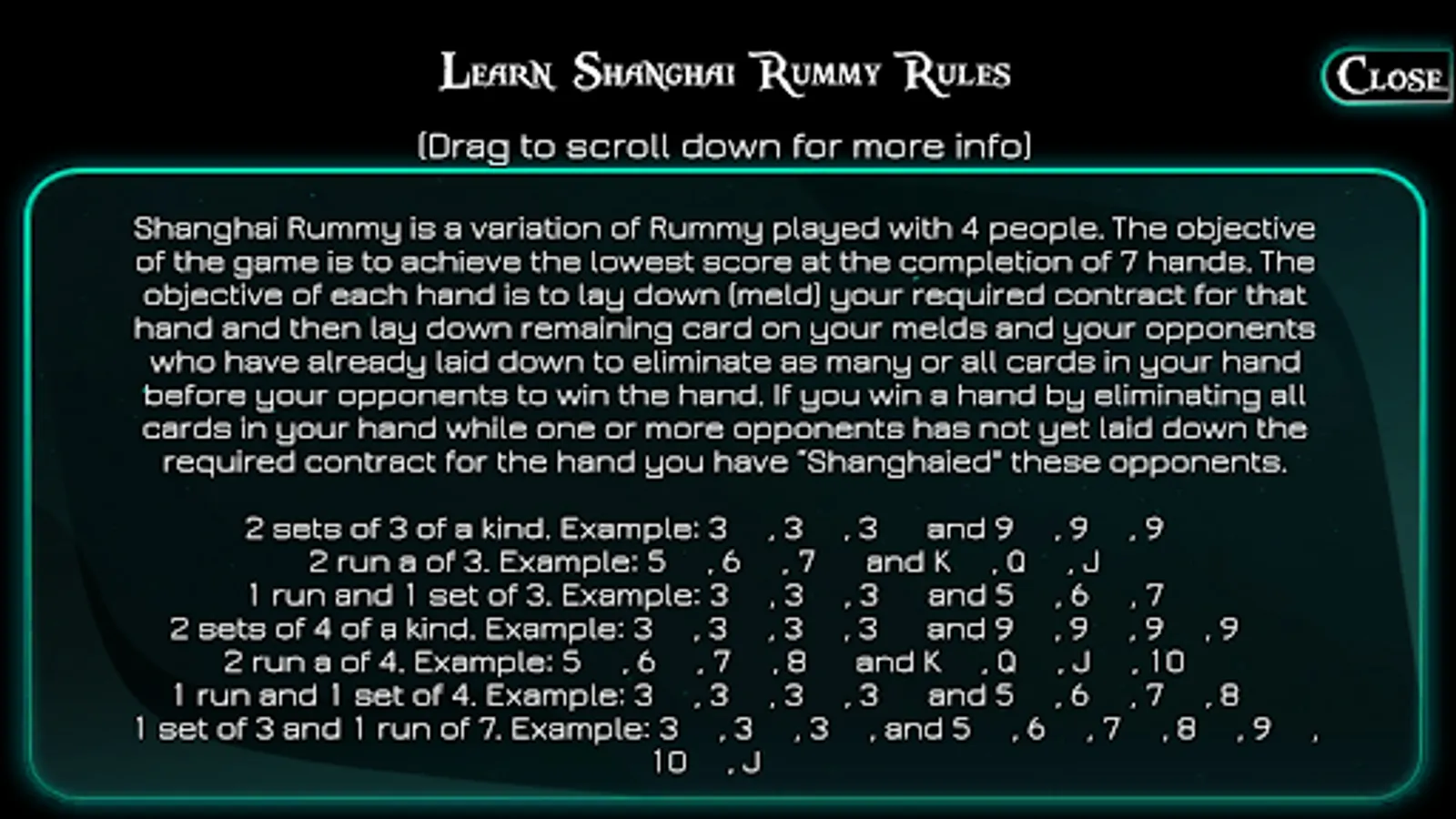 In Shanghai Rummy the objective is simple, defeat your opponents by finishing all 7 contract hands with the lowest final score. What makes this game so fun is that each hand gets more challenging and your opponents more determined to Shanghai you and lock in the lead! Host private matches with friends or join a public quick match to play the world for free today!
