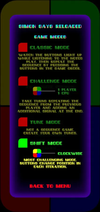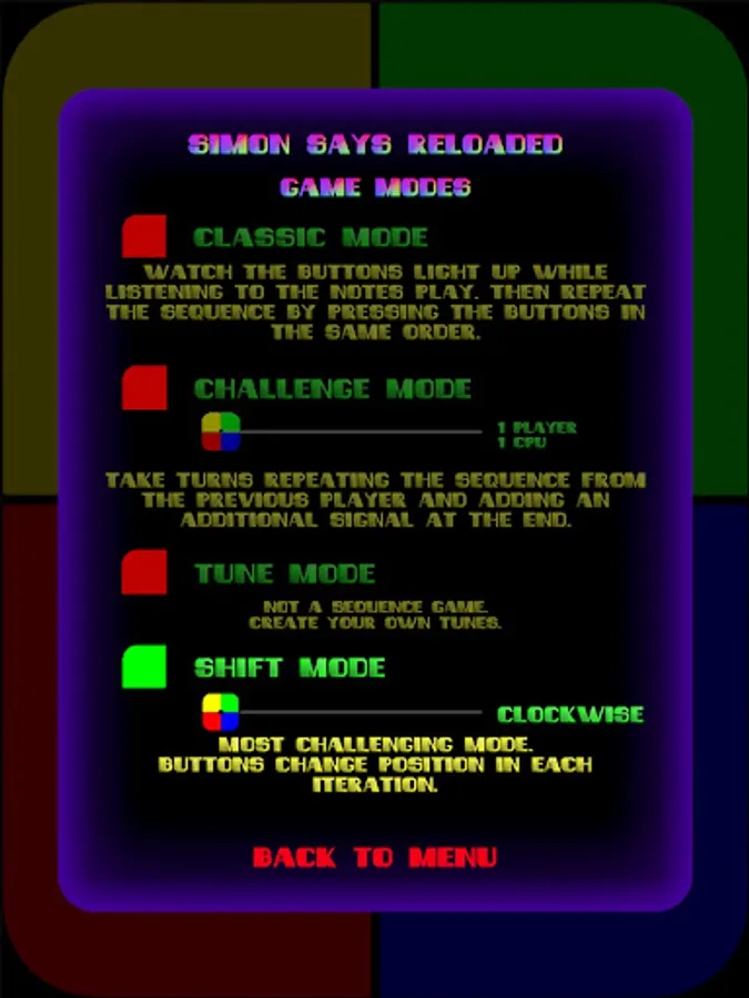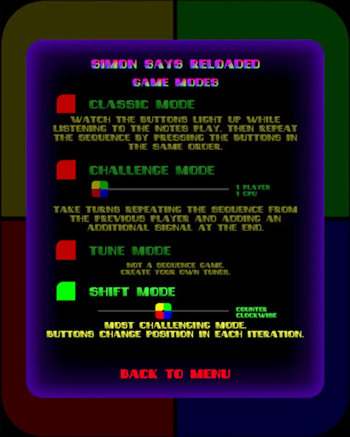 1-Classic Mode: In this mode, you must watch as the buttons light up and listen to the notes play. You must then repeat the sequence by pressing the buttons in the exact same order.