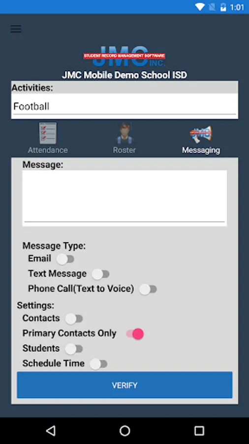 Always stay connected to your students and parents through JMC's Coach and Activity App. Whether you are on the basketball court, running the sidelines or with the marching band on the bus you can send messages to parents, look up contact information, set your rosters and much more.