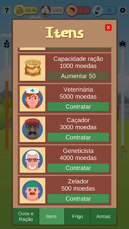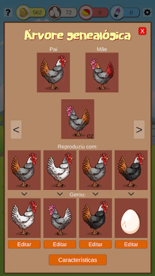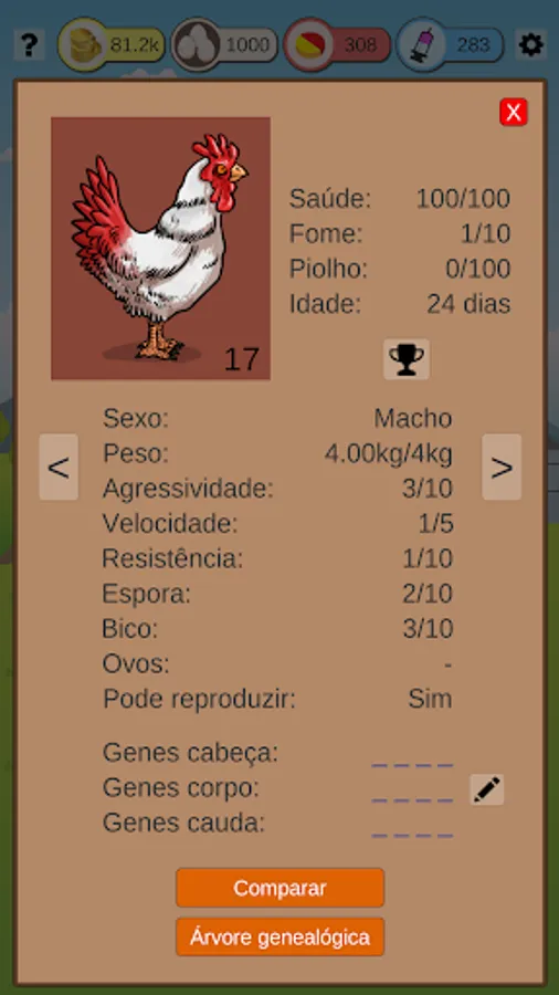 But that's not all, the Rooster and Chicken Game is also a game of genetic selection. Birds have several characteristics that are represented by a number. This value is a small variation from the average parental value. Then the player must select the parents when playing based on the trait they want to improve. Some of the characteristics are weight, spur, strength and the amount of eggs that the hen lays per cycle. The more eggs the hen lays, the more profits she generates. A hen that does not lay an egg is known as a rooster.