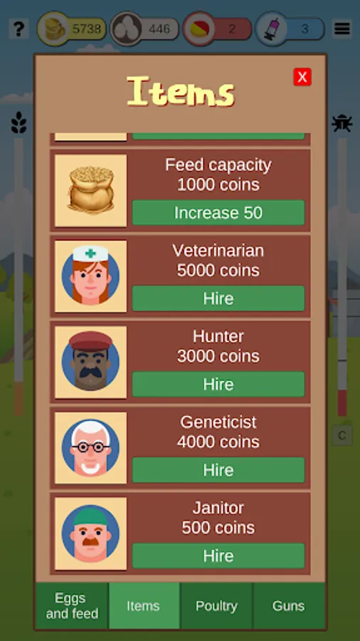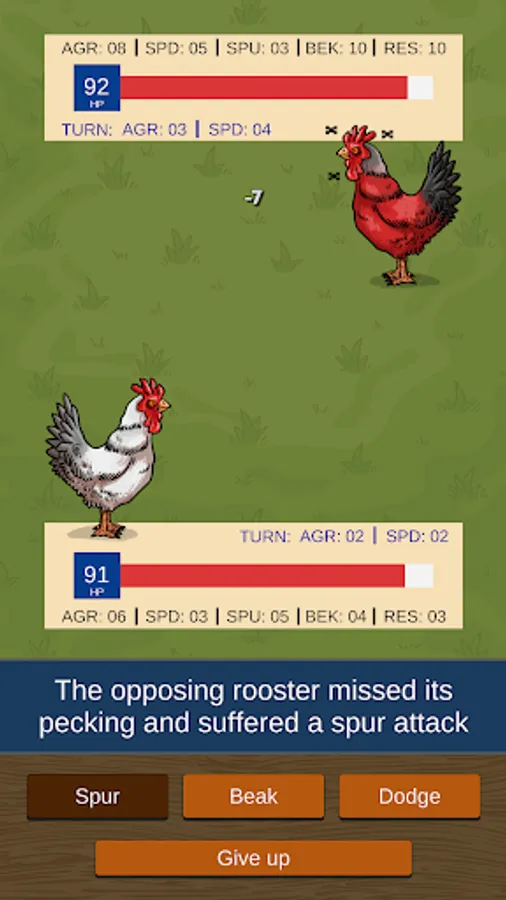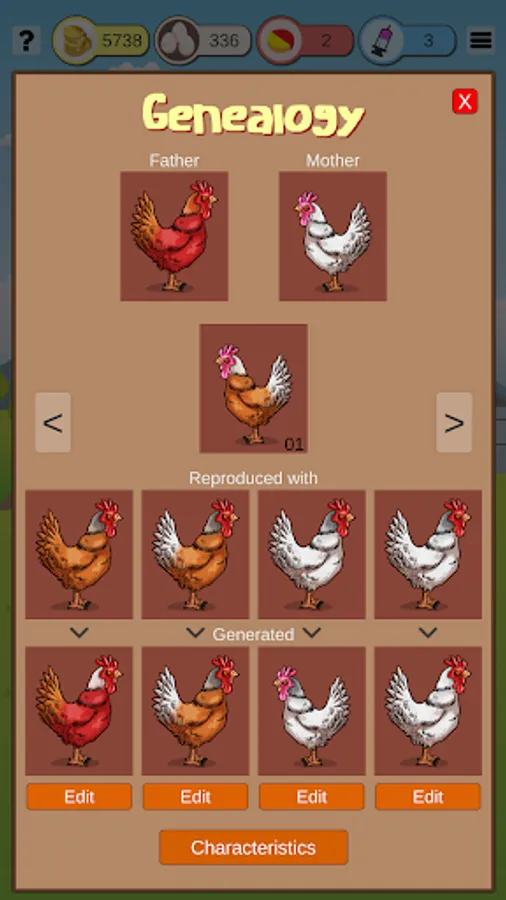 But not only that, [Rooster Game and Hen Game as well] is still a game of genetic selection. Birds have several characteristics that are represented by a number. This value is a small variation from the average parental value. Then the player must select the parents when breeding the birds based on the characteristic he wants to improve. Some of the characteristics are weight, spur, resistance and the amount of eggs that the hen lays per cycle. The more eggs the hen lays the more profits it generates. The hen that does not lay an egg is known as a rooster.