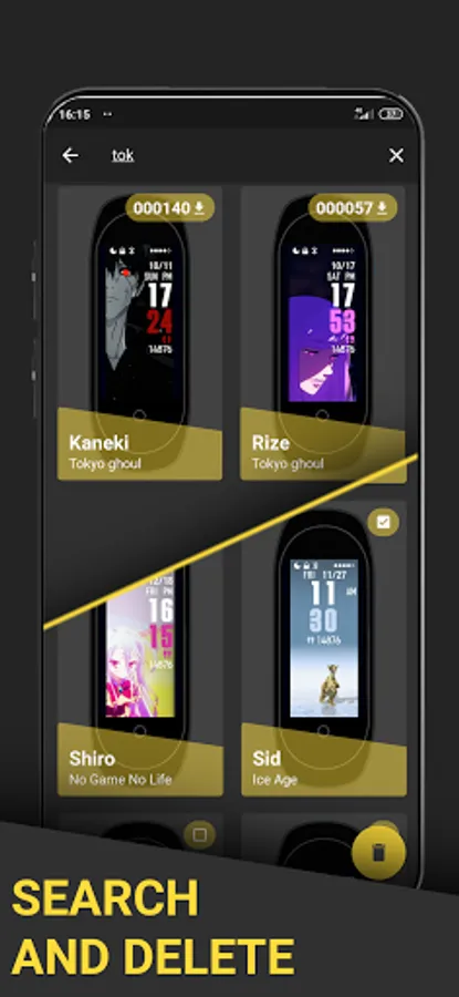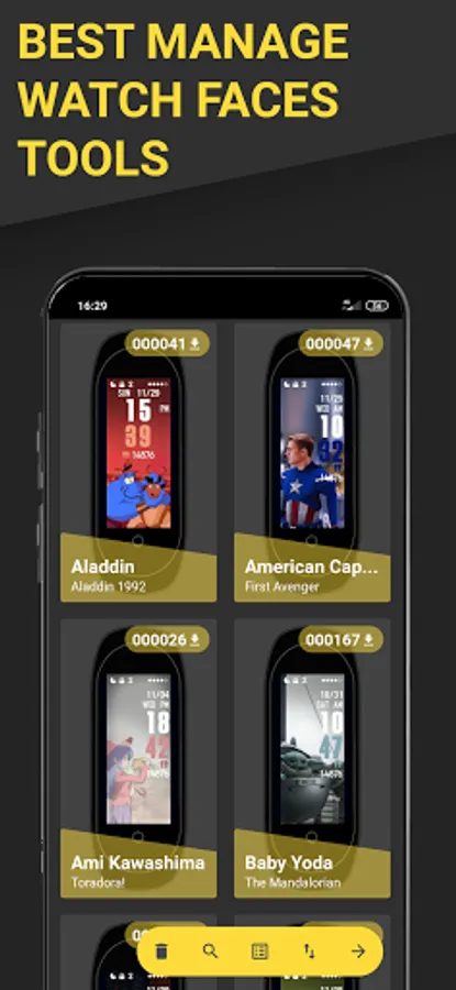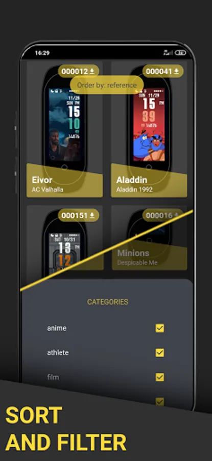 We also have different tools inside the app which will help you find the watch face you want more easily. Inside the app, watch faces are classified by name, but also by a reference. That means that as the main reference of each watch face will be the character that appears in it, but as a secondary reference it will have the movie, anime or wherever it appears in. This will make easier the way you look for a specific topic. But also, in case you do not know exactly what you want, you can sort by name, reference, number of downloads, category or date of upload. That way you can see all of them in a better way.