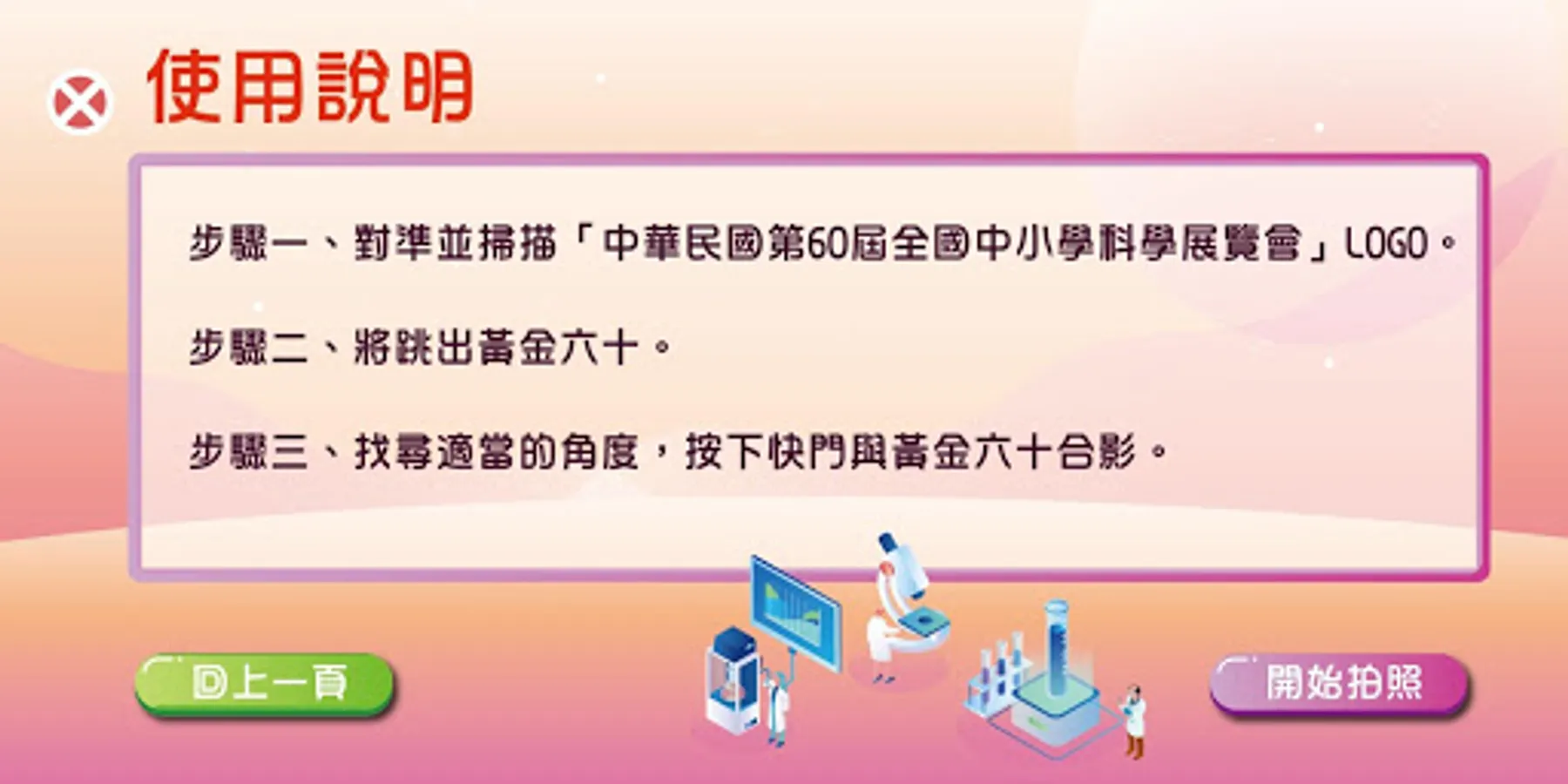 開啟APP進入主畫面,點擊「開始拍照」即出現掃描畫面,在臺北舉辦的中華民國第60屆全國中小學科學展覽現場尋找科展LOGO,掃描LOGO後,就會看到黃金一甲子60的代表數字,可以與其互動,互動後還可以和他們一起拍照!拍照時可自行調整黃金一甲子60位置及大小,拍出最滿意的合照喔!
