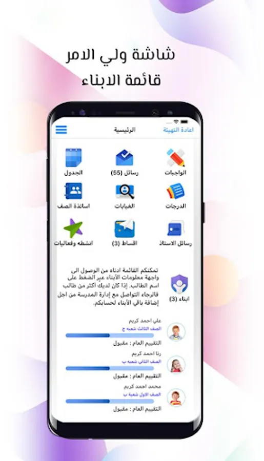 يدعم هذا التطبيق مختلف انواع الحسابات لكل من الطالب والهيئة التدريسية واولياء الامور بواجهة وصول خاص من اجل ادارة حساباتهم ومتابعة تقدم التحصيل الدارسي - حساب اولياء الامر سيسمح بالوصول لكافة متعلقات الاهل بقوائم الطلبه والابناء ضمن نفس المؤسسة التعليمية.