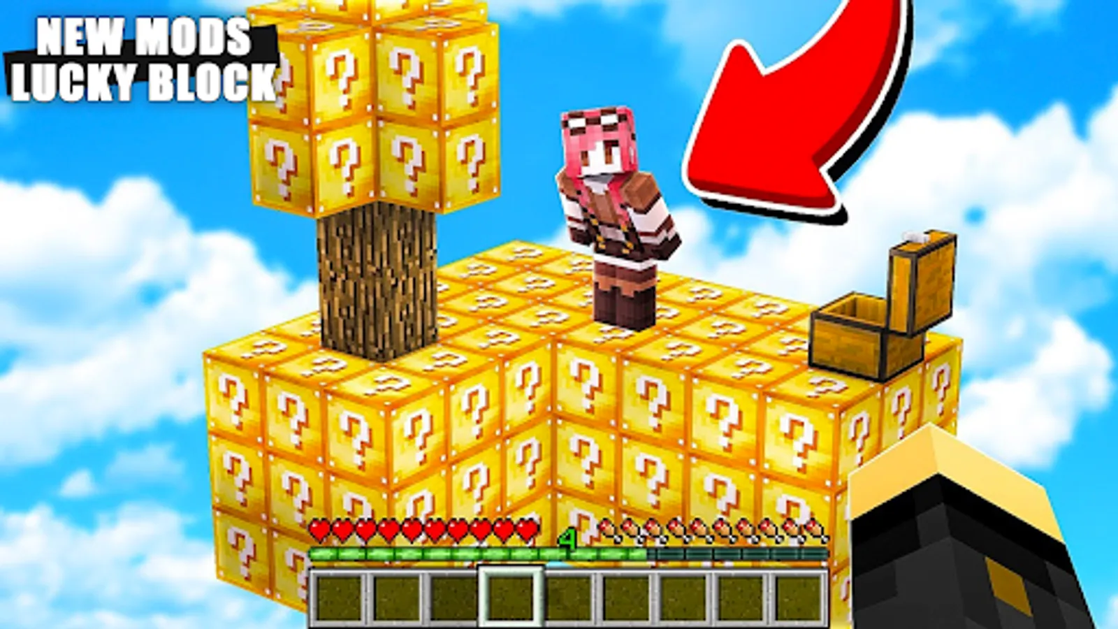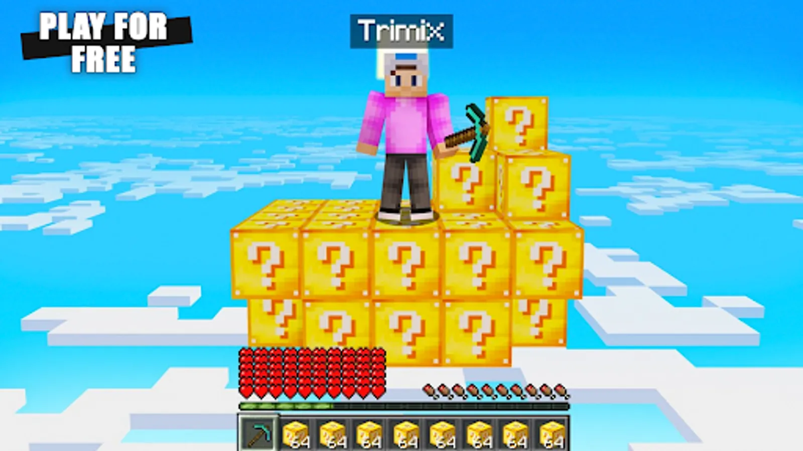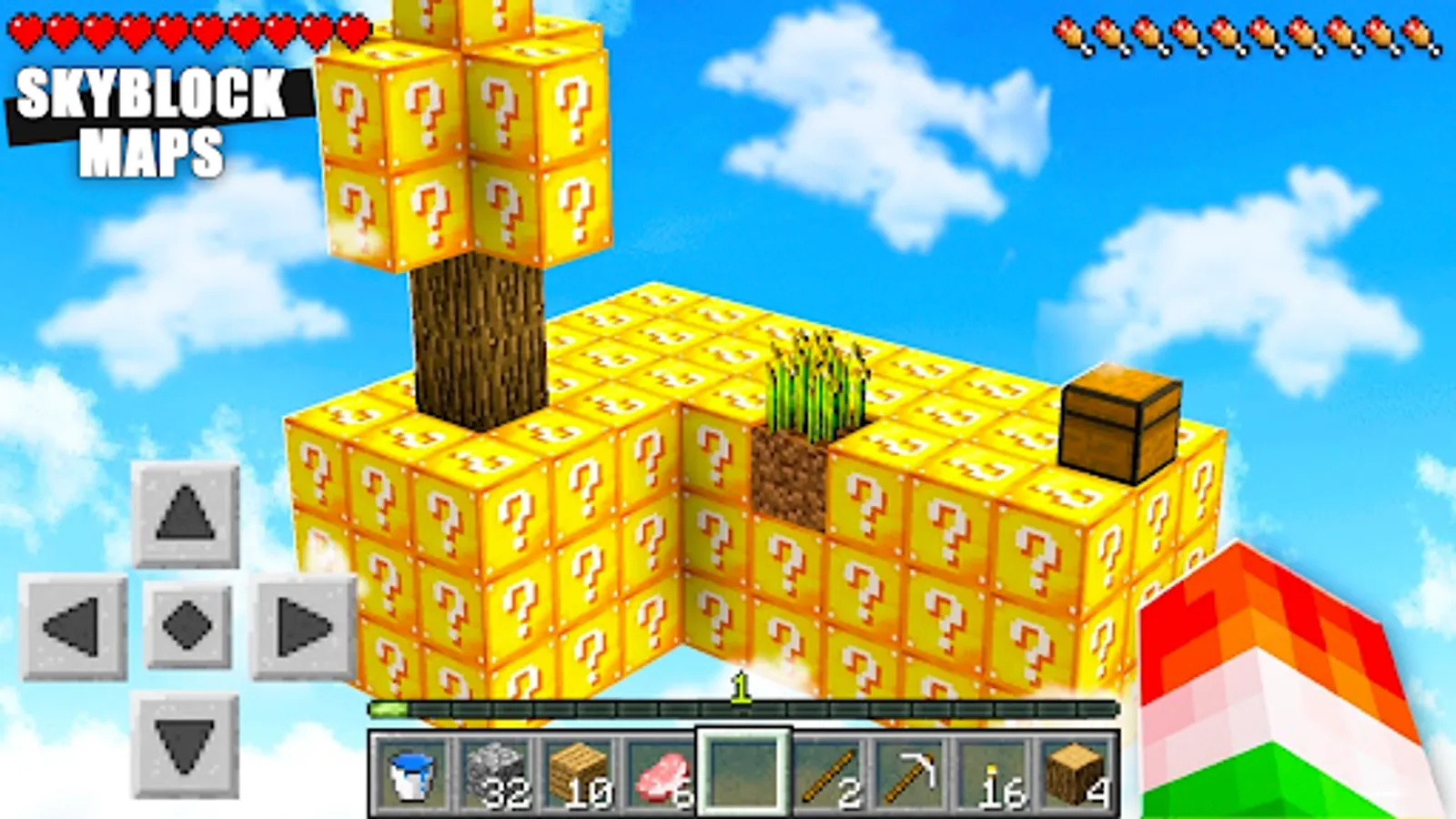 Lucky Block mod for Minecraft Pocket Edition adds skyblock in your MCPE world to craft on maps with epic items and skins to explore island and biomes.