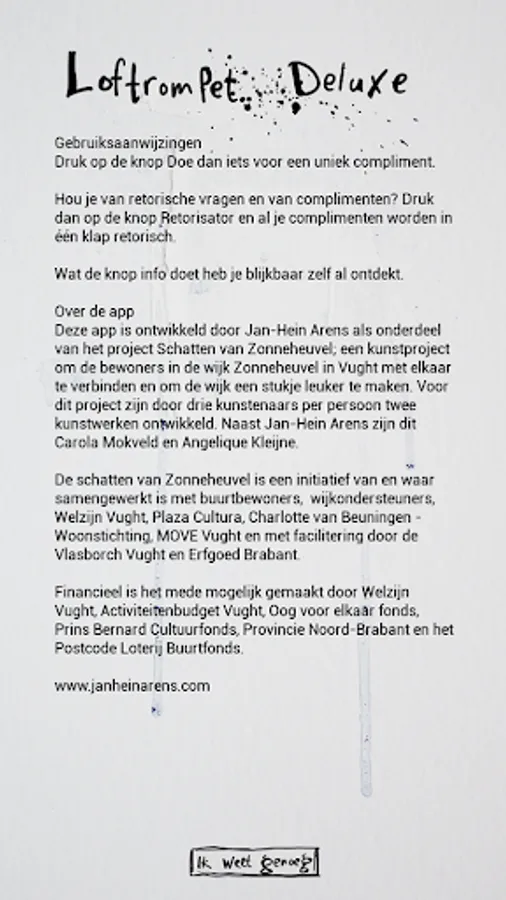 This app was developed by artist Jan-Hein Arens as part of the art project Schatten van Zonneheuvel (a neighborhood in Vught). The aim of the project was to connect residents more with each other and to make the neighborhood a bit more fun. The residents have provided input for the basis of the compliments.
