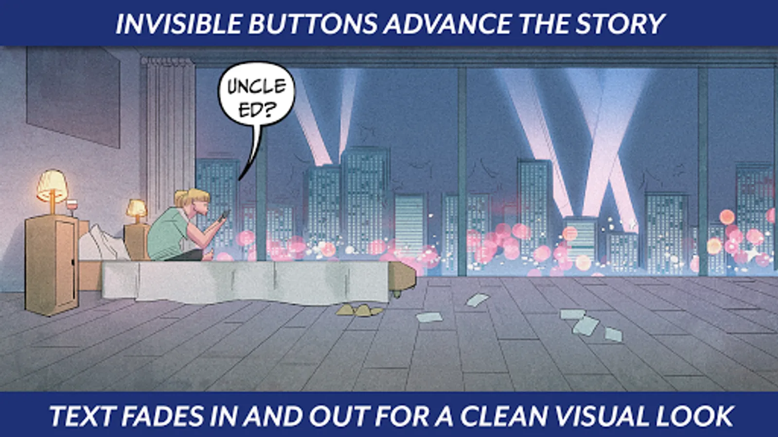 • Hidden buttons allow the user to interact with the story, advancing the word balloons at the reader's pace. A swipe motion skips the comic book pages forward or back.
