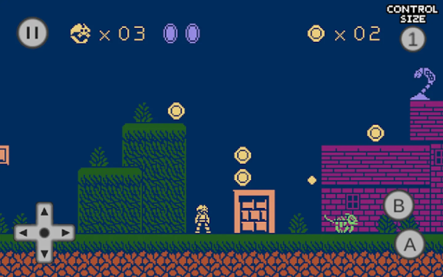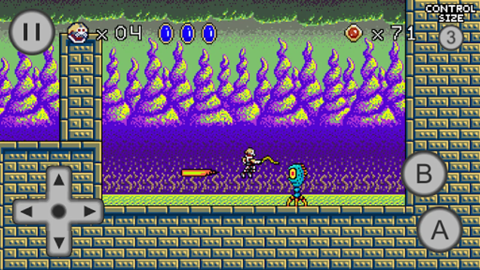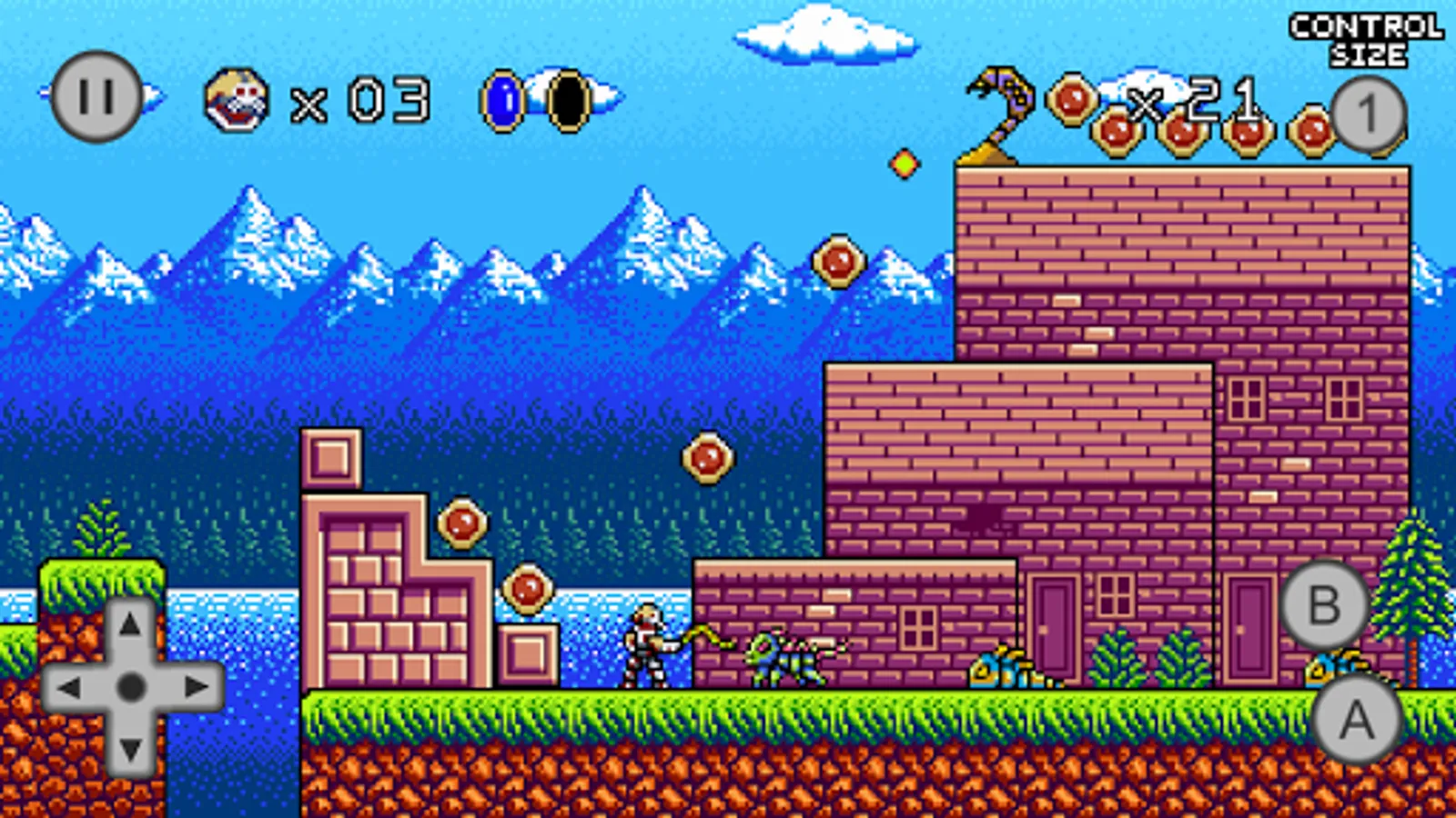 Designed as if it were on an 8-bit or 16-bit console, but optimized to play great on a touch screen. There are currently 3 on screen control sizes to choose from; the original size, plus 2 larger ones. Screenshots showing all 3 sizes are in the gallery on this store page.