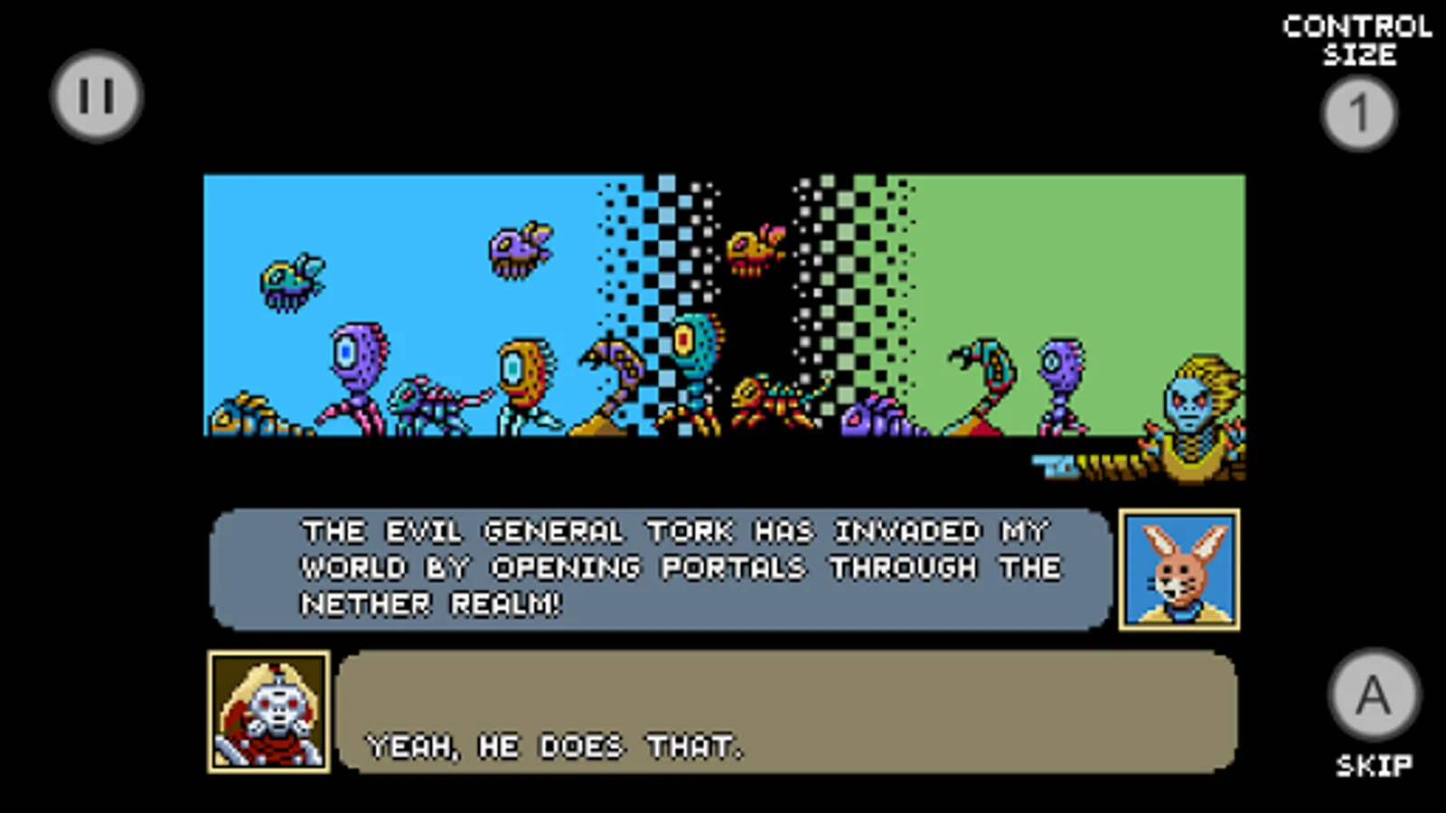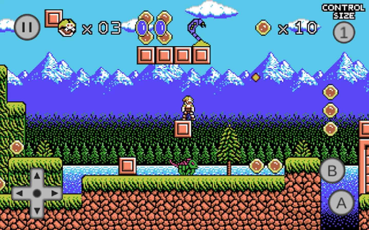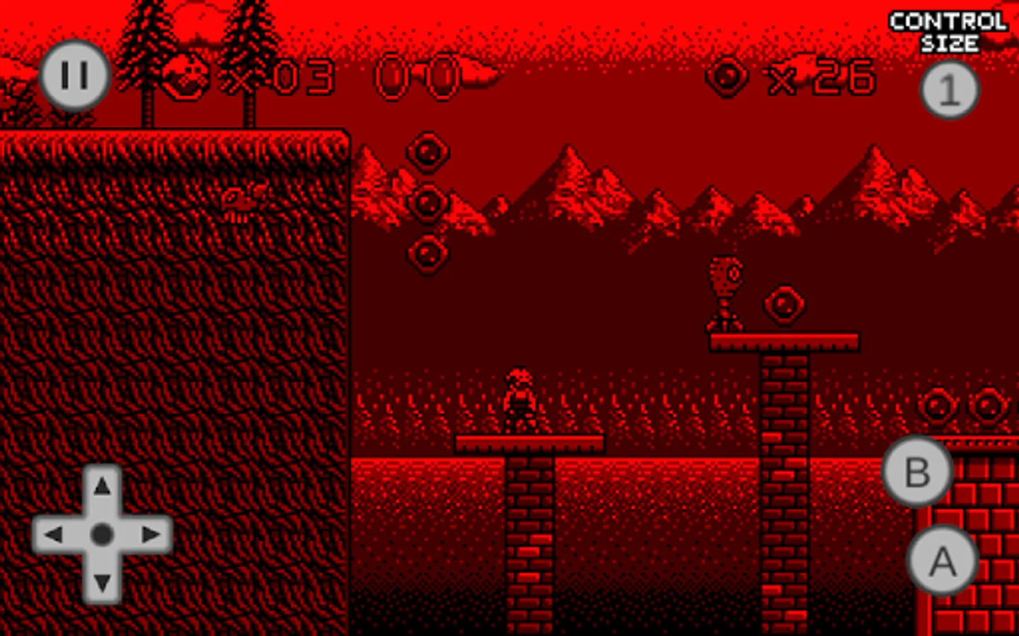 Designed as if it were on an 8-bit or 16-bit console, but optimized to play great on a touch screen. There are currently 3 on screen control sizes to choose from; the original size, plus 2 larger ones. Screenshots showing all 3 sizes are in the gallery on this store page.