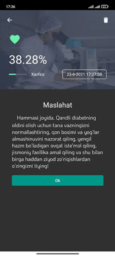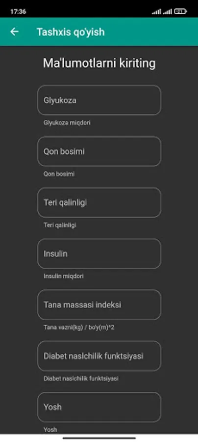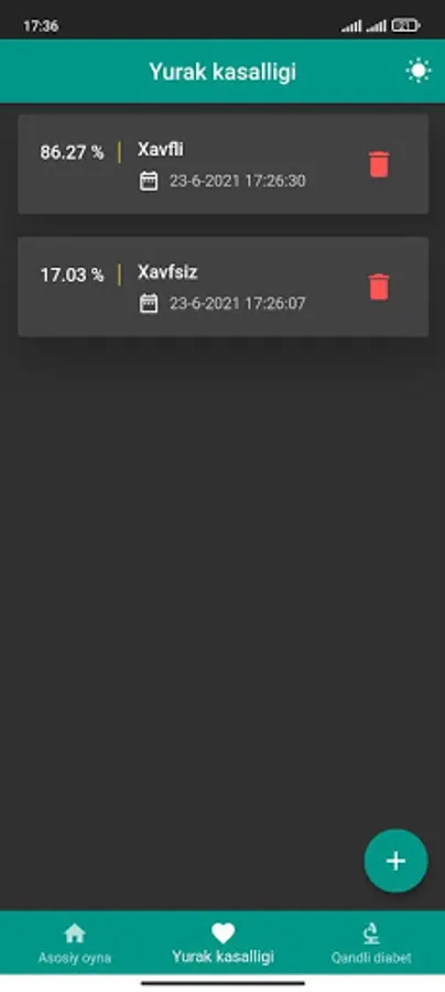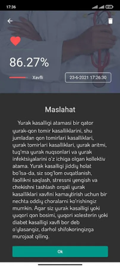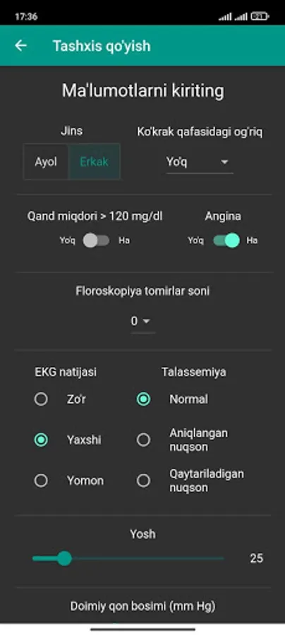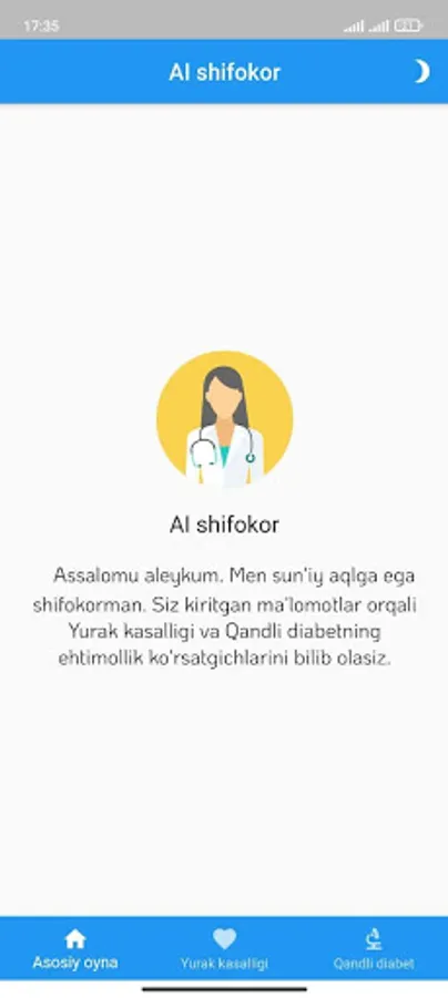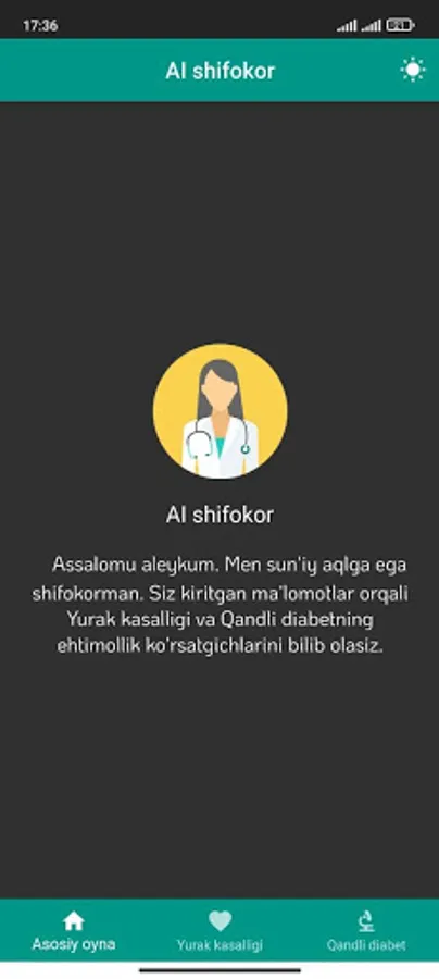 AI shifokor yordamida siz kiritgan ma'lomotlar orqali Yurak kasalligi va Qandli diabetning ehtimollik ko'rsatgichlarini bilib olasiz.