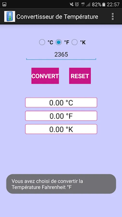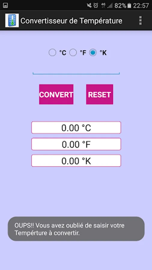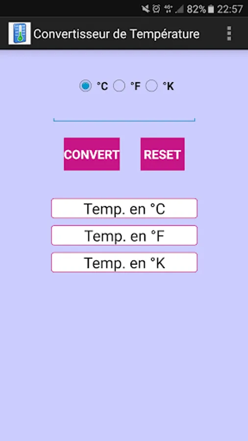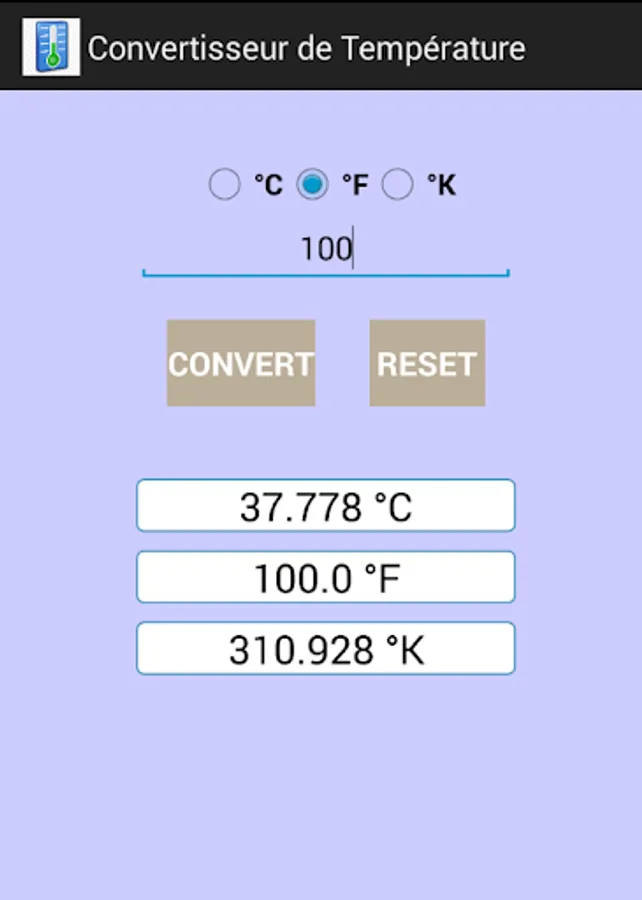 The application is easy, simple and free, It allows you to convert temperature Celsius (° C) to (° F) and (° k), Fahrenheit (° F) to (° C) and (° k) (° K) to (° C) and (° F).