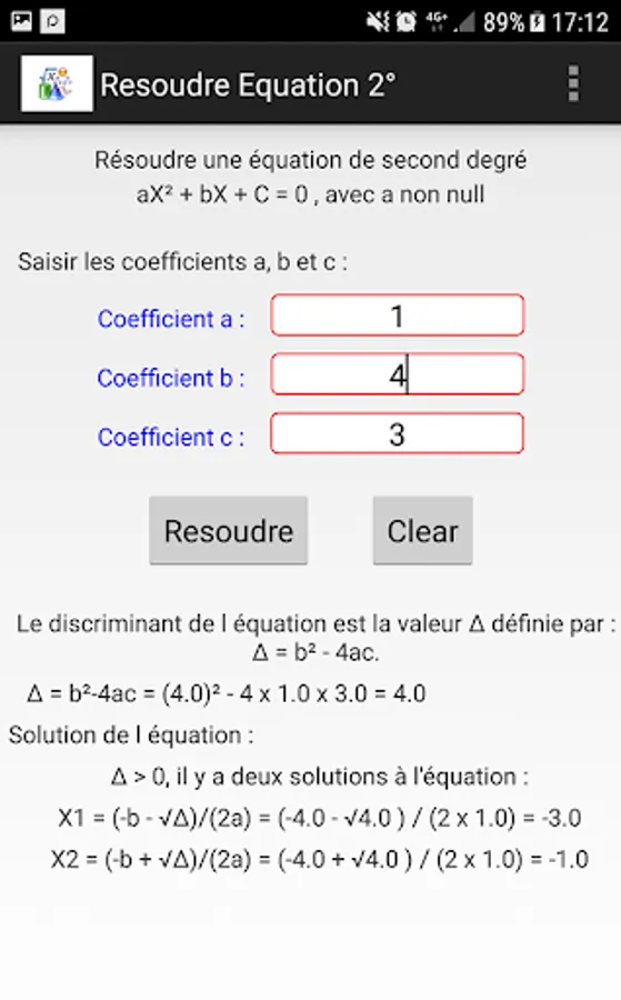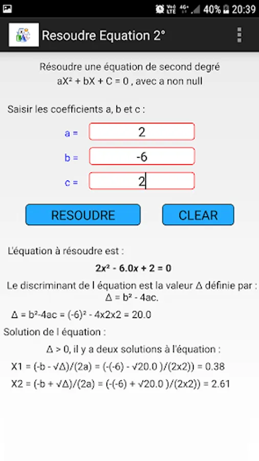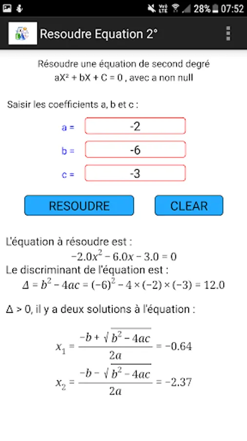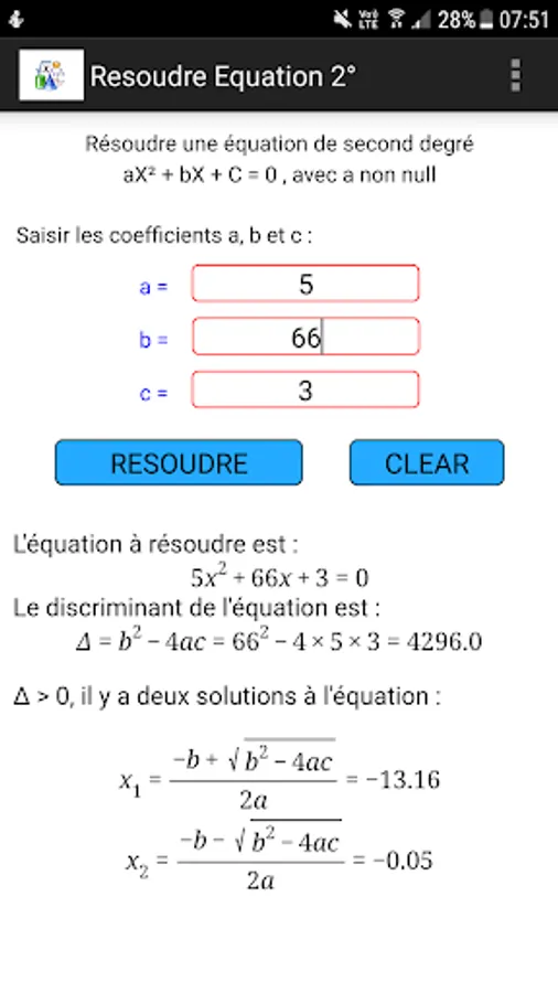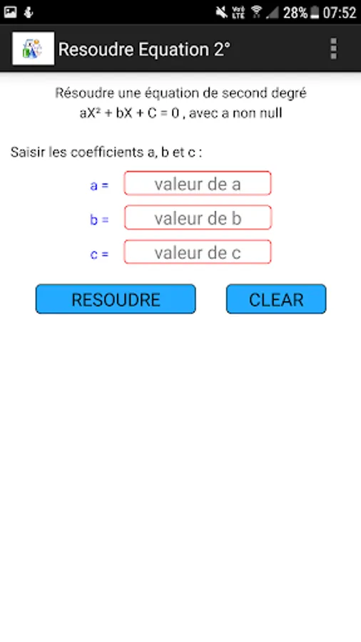 To solve the equation, I invite you to enter the values a, b and c as shown in the interface of the application, if your equation is in the form ax² + bX = 0 the value of C is 0 so you have entering 0 as c value and if in the form ax² + C = 0, the value of b is 0, thus 0 must be entered as the value of b.