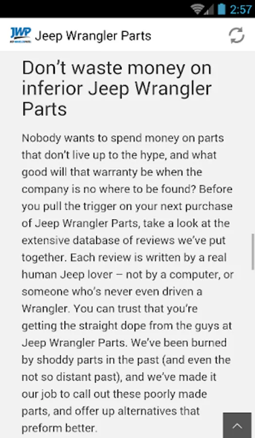 Jeep Wrangler Parts is run by Jeep enthusiasts who live and breath Jeep. We've made plenty of mistakes with our own money over the years, buying bad upgrades, or parts that just don't hold up. We decided to pool our knowledge and create an app that could help other Jeepers when it comes time for their upgrades.