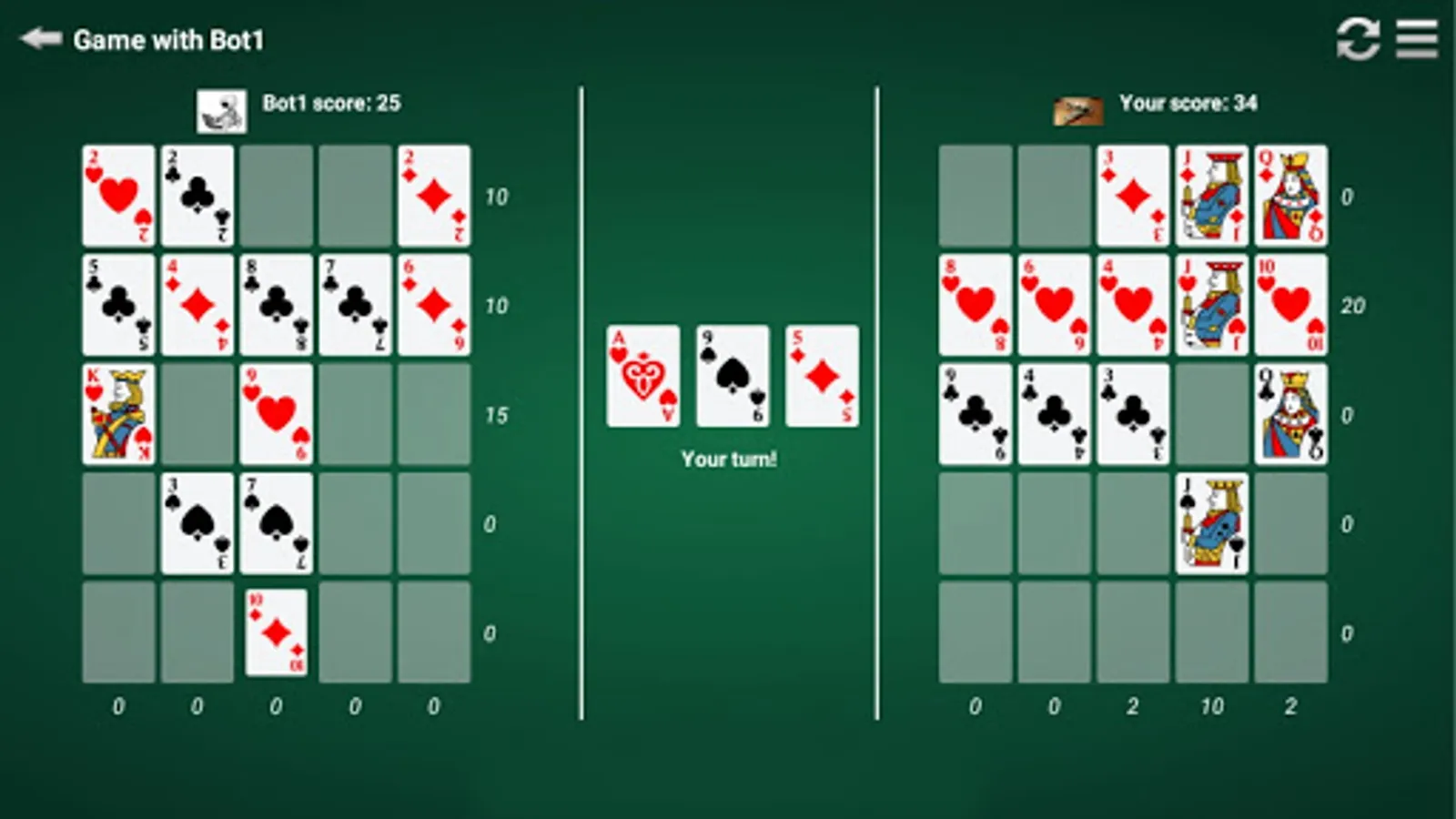 The game is based on classic poker squares, but here playing against an opponent (Bot or human).