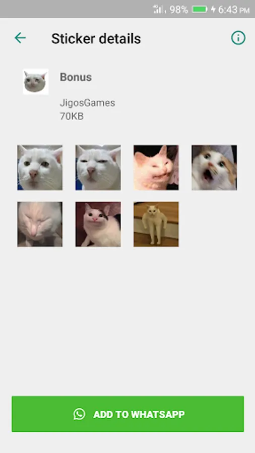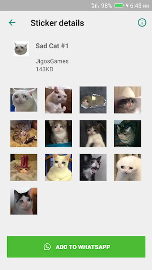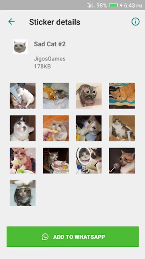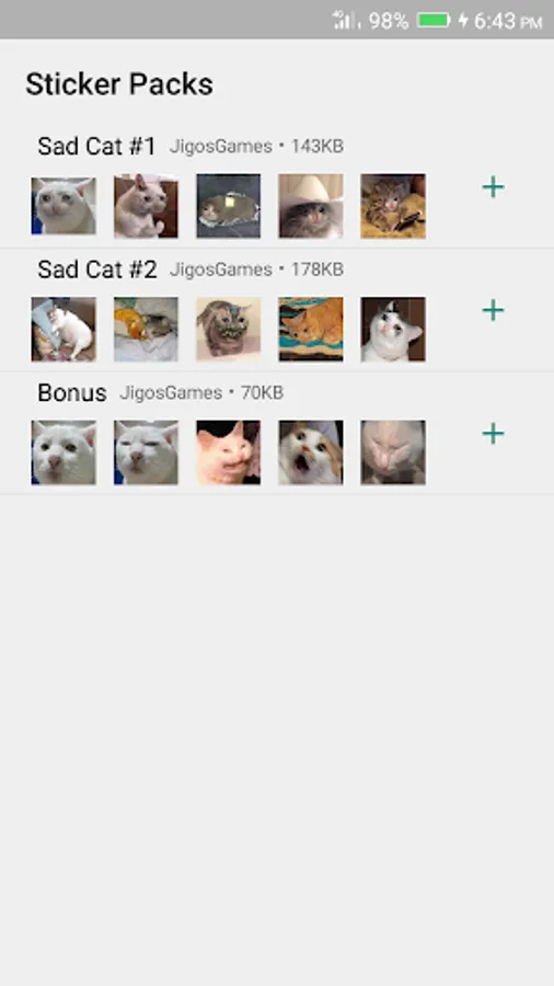 This app contains 2 packages of Sad Cat stickers and a bonus package of other funny cat stickers.