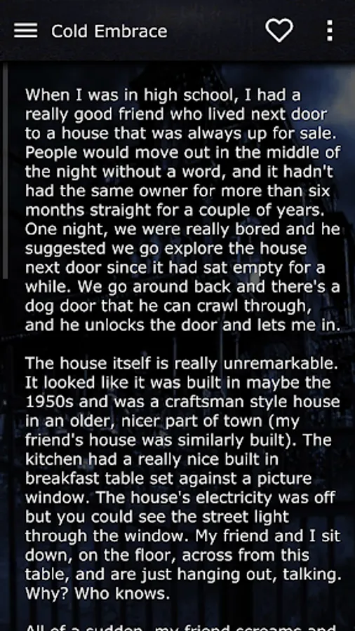 Looking for a good scare before going to bed? This app includes a collection of true scary stories gathered from Reddit threads that will make you sleep with your lights on! It includes a variety of different themes from paranormal phenomenons, strange and inexplicable occurrences to stalkers and real life threats, from ghosts and cryptids to unsolved mysteries, everything to keep you on edge.