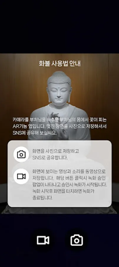 The Hwabul application uses augmented reality technology to add video effects to the Buddha statue to express the beauty and sublime teachings of the Buddha.