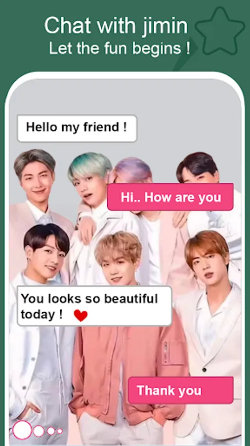 Immerse yourself in the fantasy of talking to Jungkook,jimin ,v ,RM, and J-Hope with just a tap of your finger, and share your simulated interactions with friends and fellow army members , and let the bts fever spread far and wide.