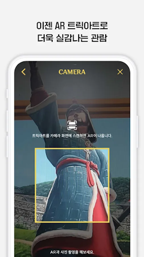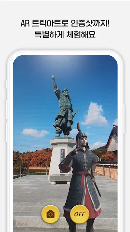 In AR Trick Art, you can enjoy Sambyeolcho-related trick art (mural painting) located in Jindo Yongjangseong Promotion Hall, and re-illuminate historical events realistically through AR.