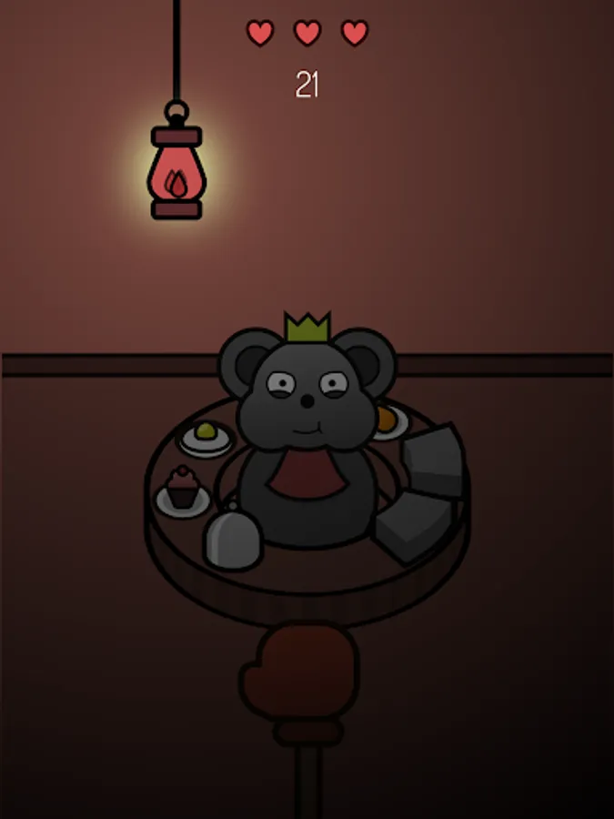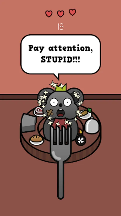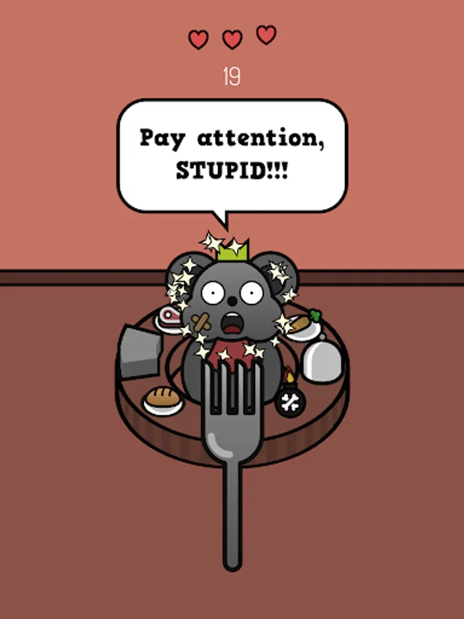 Well, it seems easy, right? Wait for the rotating table to set, and when the food is in front of you, touch the phone screen! Of course, there is always something unexpected in this work, for example sometimes the table rotates too quickly, or some assassin hired by King Kitten has exchanged some chicken thigh with explosive bombs ... Or someone turned off the light during the banquet ... But the harder obstacle is surely the talk of King Roden: can you bear it without punching his face? I bet no!