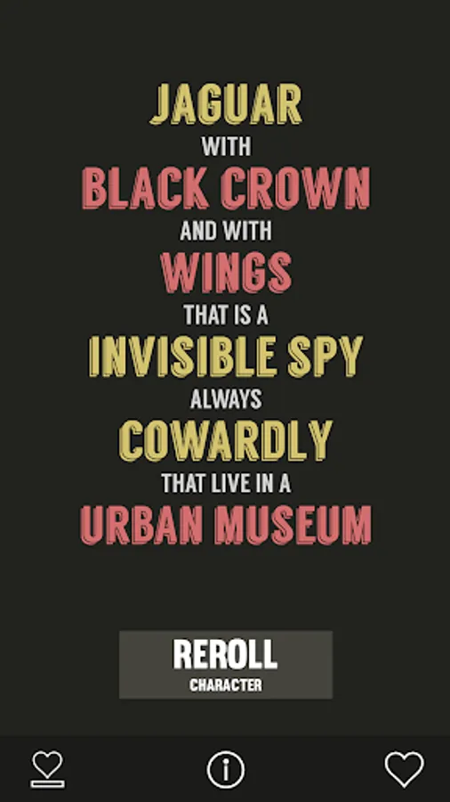 It comes really handy when you are in front on a blank page and you are looking for new ideas, or just tap the button to generate the leading actor of your next story or drawing (or, you know, just for fun).