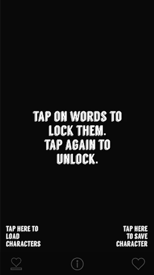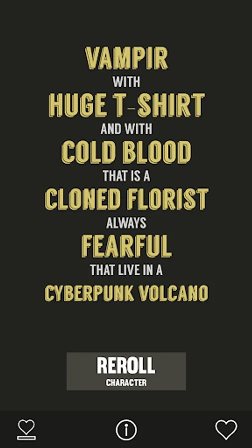 Open Character Design Generator and a short phrase is created, containing the features of the figure; then you can lock some traits that you like and tap "reroll" to generate different traits, keeping the locked ones, shaping the character to your needs.