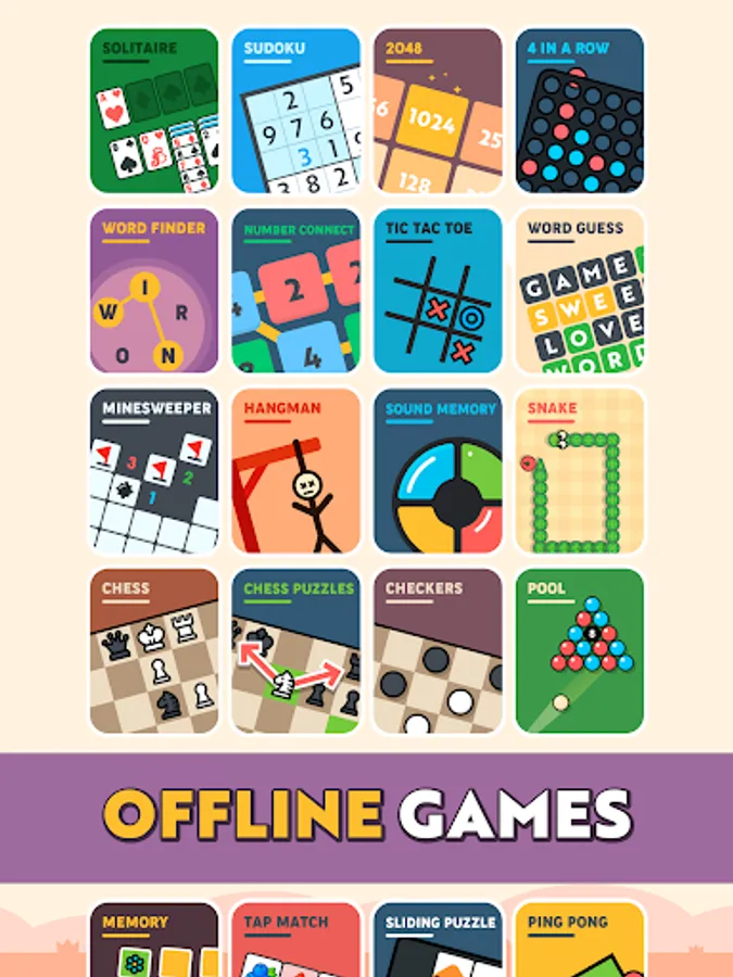Get ready for 'Offline Games': fun for all ages, and a mental workout too! This offline game collection is like an overflowing toy box packed with more than 20 unique minigames. It's designed for classic game enthusiasts, puzzle lovers, and challenge seekers. And the best part? You don't need an internet connection to enjoy it!