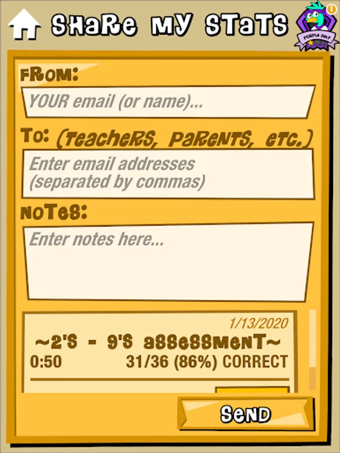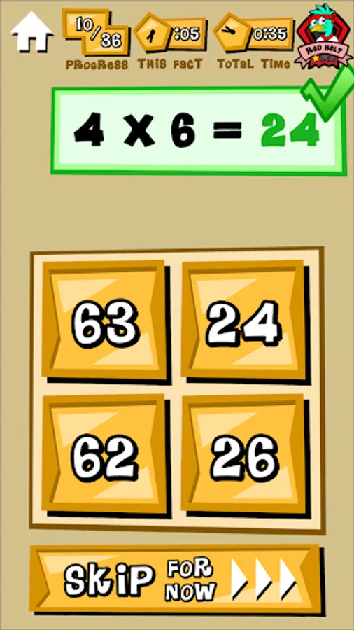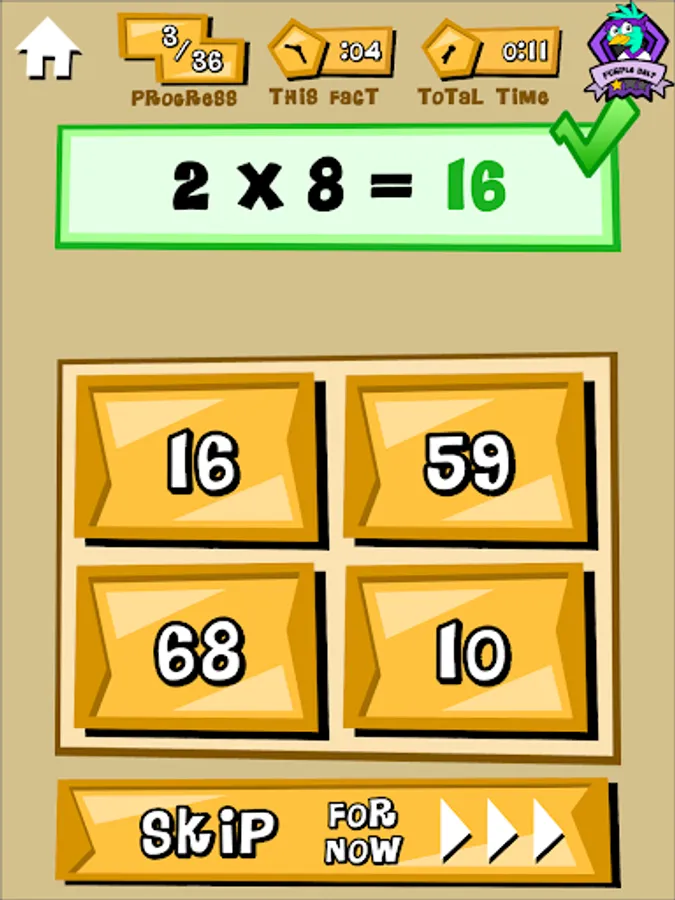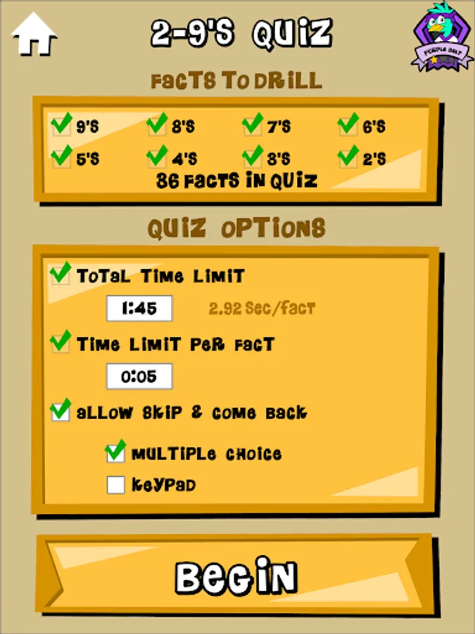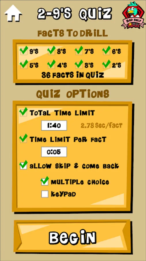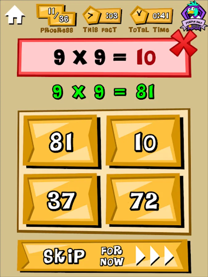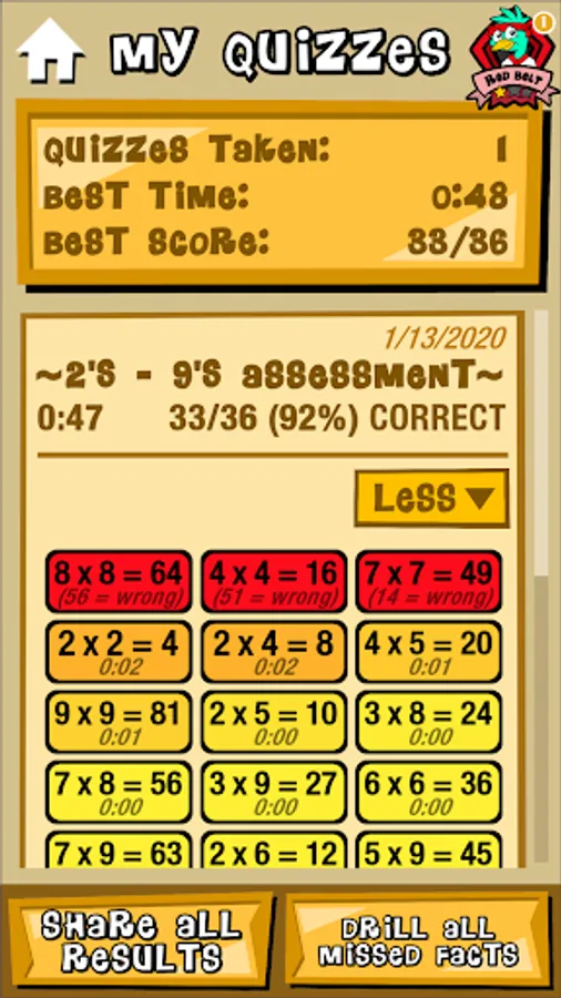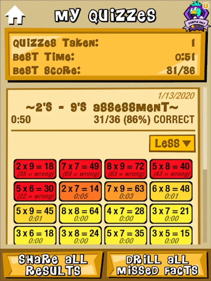Timed tests of multiplication facts 2's thru 9's. Faster and more accurate scores earn higher ranks. Review missed problems. Study hints. Email results to teachers and parents.
