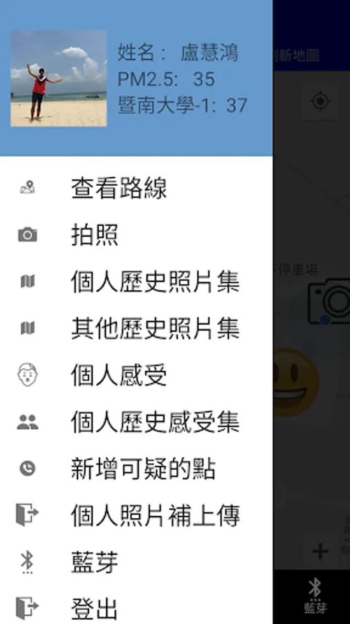 (5)綜合地圖瀏覽:上述所展示的照片、感受與懷疑的點上傳之後,會依照上傳的地點在對應的地圖上標示出圖案。