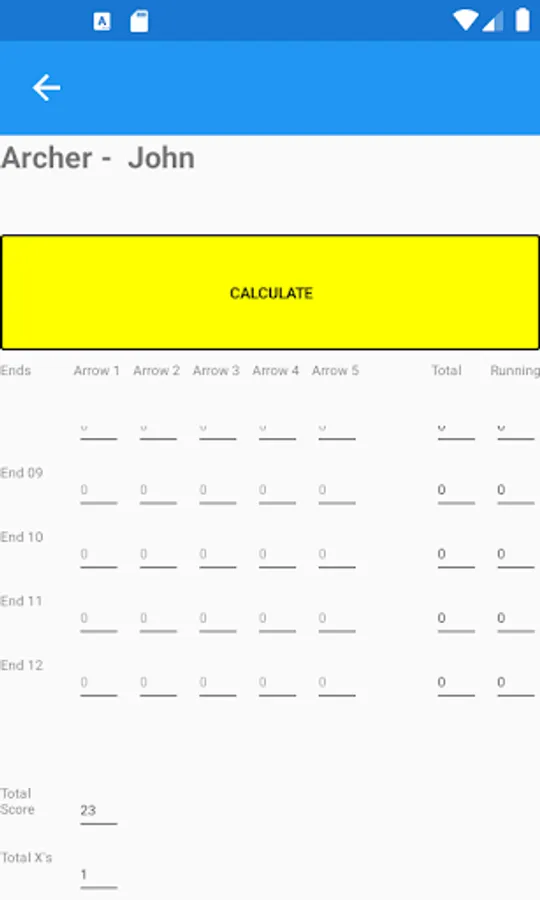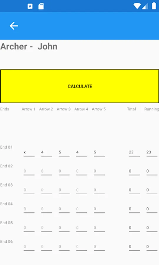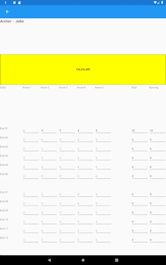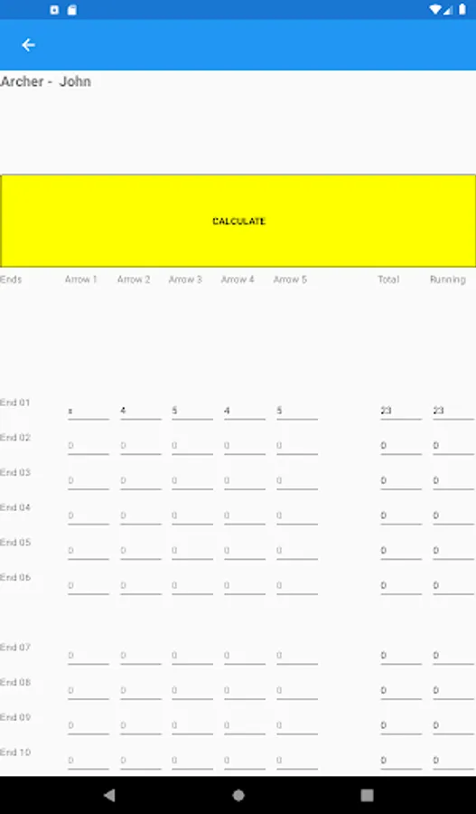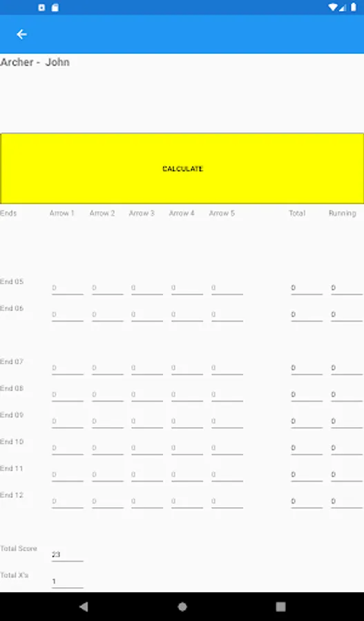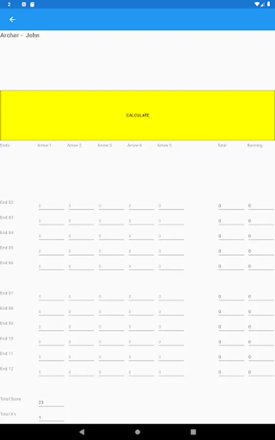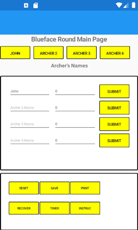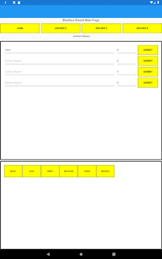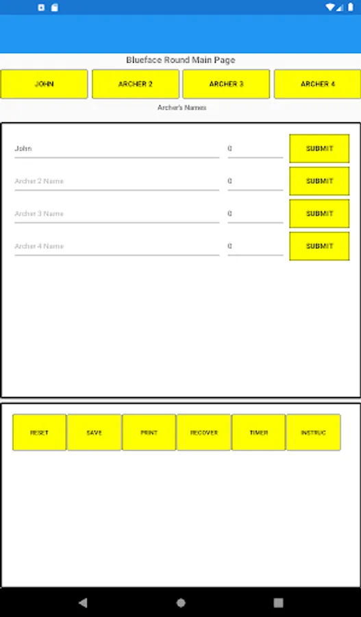 The Blue face round is shot with either a 40 centimeter or 5 spot blue target, with a white center. It consists of 5 arrows in each of 12 ends, for a total of 60 arrows. Each end has a 4-minute time limit. The maximum possible score is 300 points. An "X" is also counted as they act as a tie breaker. This application provides the user with the capability to track the scores of up to 4 archers shooting a Blue Face round. It has the ability to save rounds and recover them for review. Also included are a Printing function (using a PDF format) and a timer.