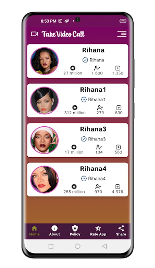 so you can use the app rihana video call for free ,and you recive rihana fake video call and do a fake video call with rihana for free 100%