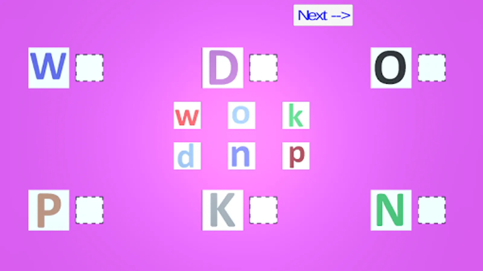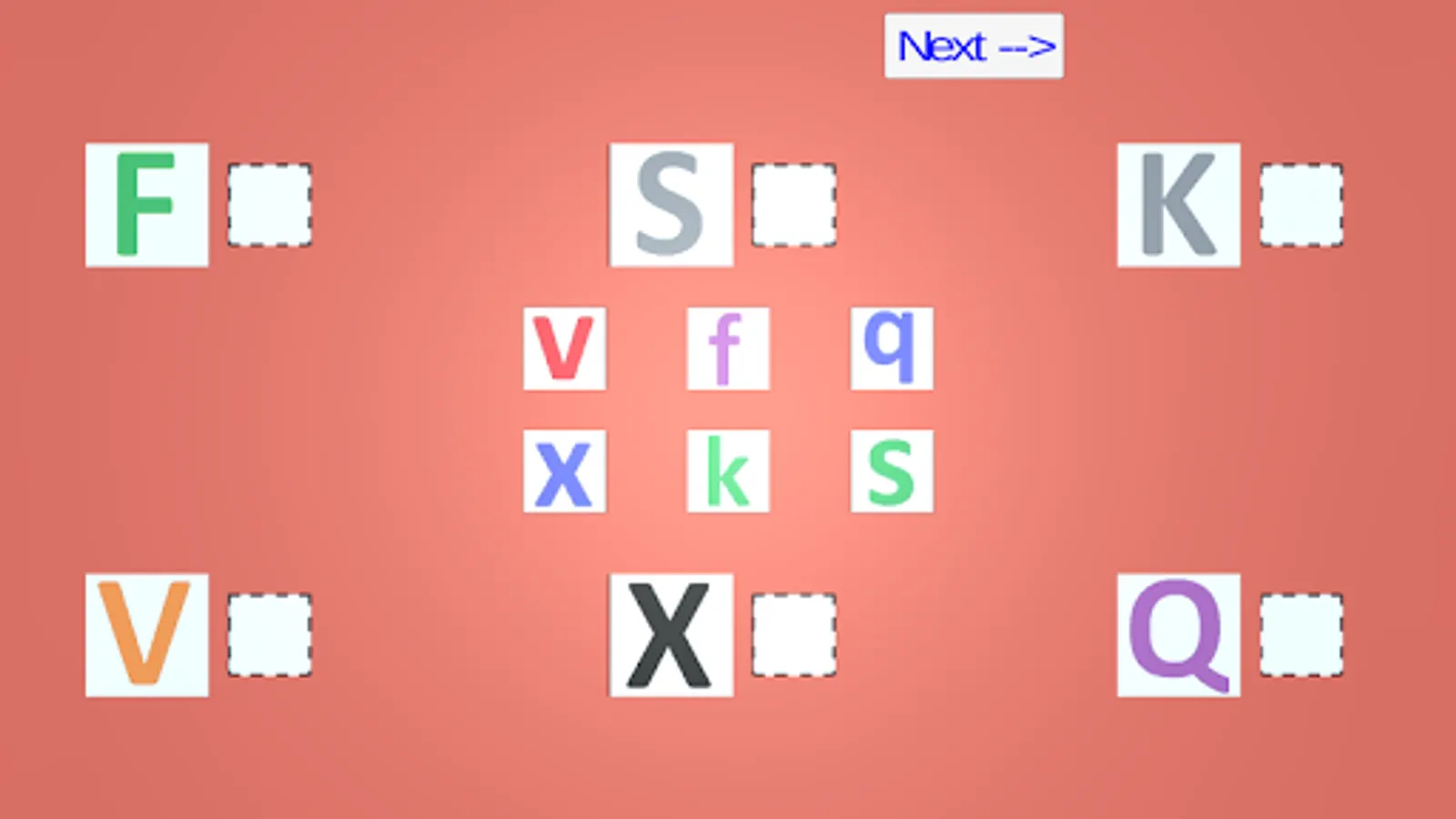 Preschool game to help children learn their lowercase and uppercase letters. The board features 6 random uppercase letters and their lowercase counterparts. Move the lowercase letters into the squares next to their uppercase counterparts.