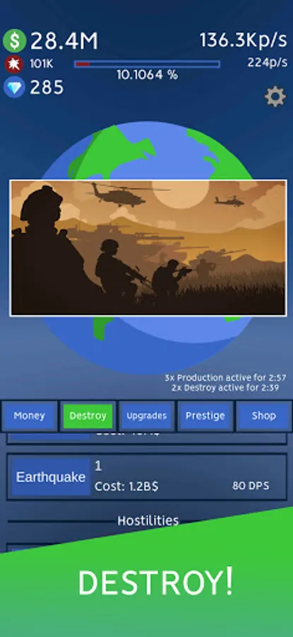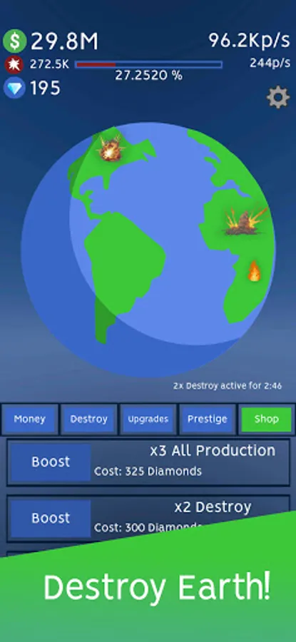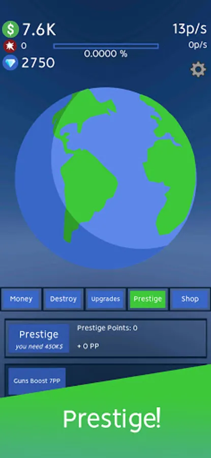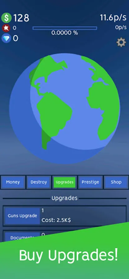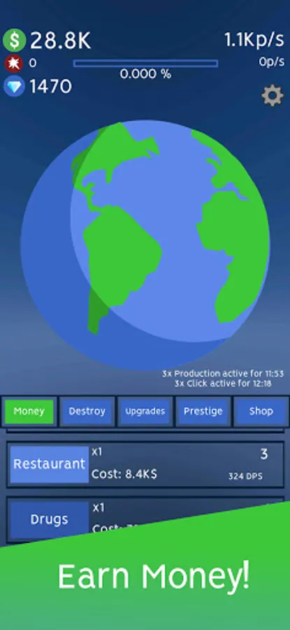 Destroy Earth is an offline clicker simulator that is not easy. It is that by earning money you can start destroying the world, when the world is destroyed you will earn a ranking point, so race with other people for the first place in the ranking!