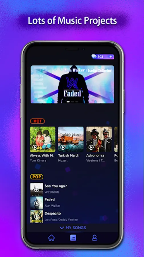 Cooperate with many different types of top music producers, pop, classic, anime, etc. You will find many familiar beats, such as See You Again, Faded, For Alice, Jingle Bells! And more new pop songs and beats are being updated!