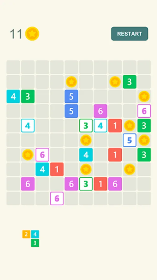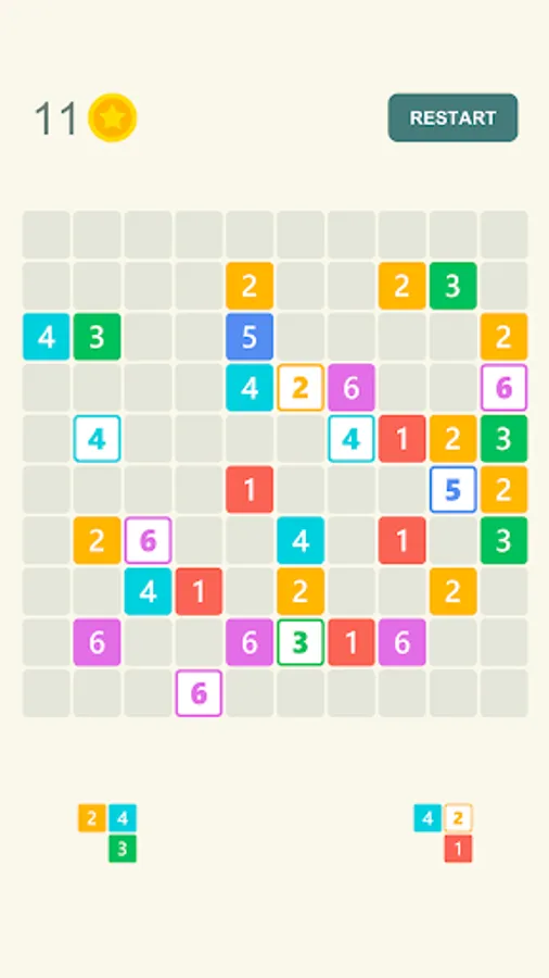 Stack the tetraminos on the board to match the same numbers. Matched numbers will be combined in a chain and disappear from the field, increasing your score.