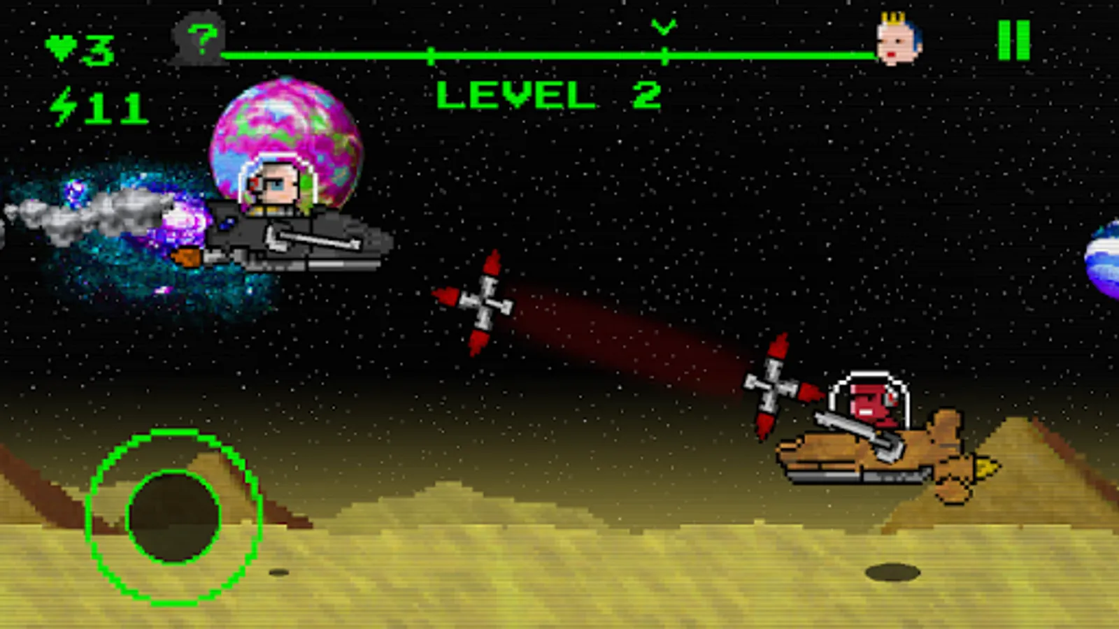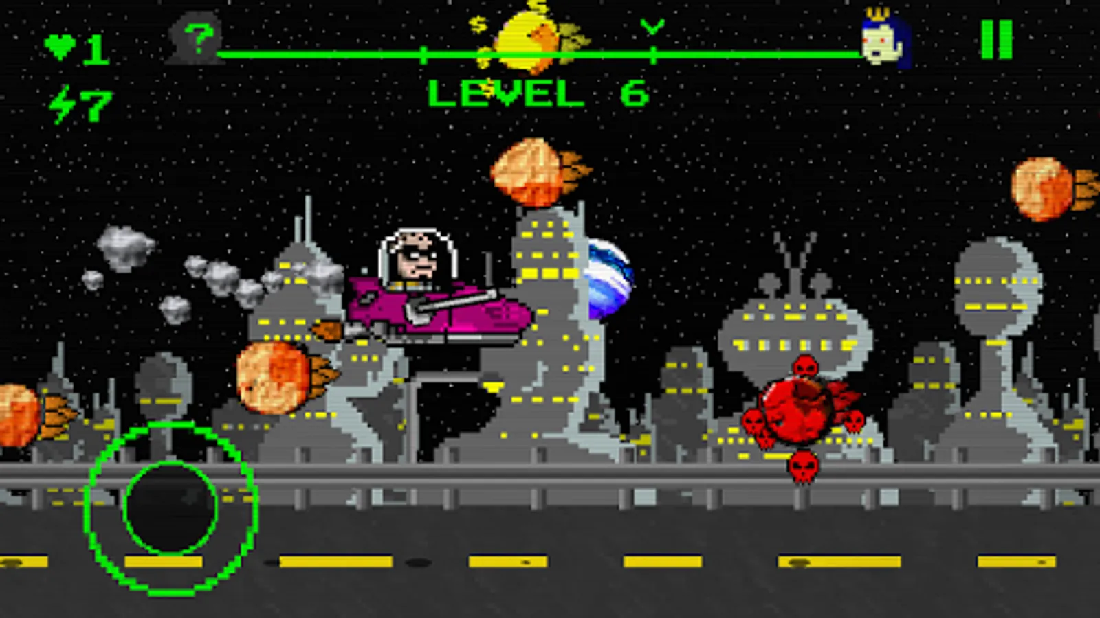 Pass by the most different and weird planets, dodge asteroids, escape the police, and fight against robots, ogres and even against pigeons to save your princess.