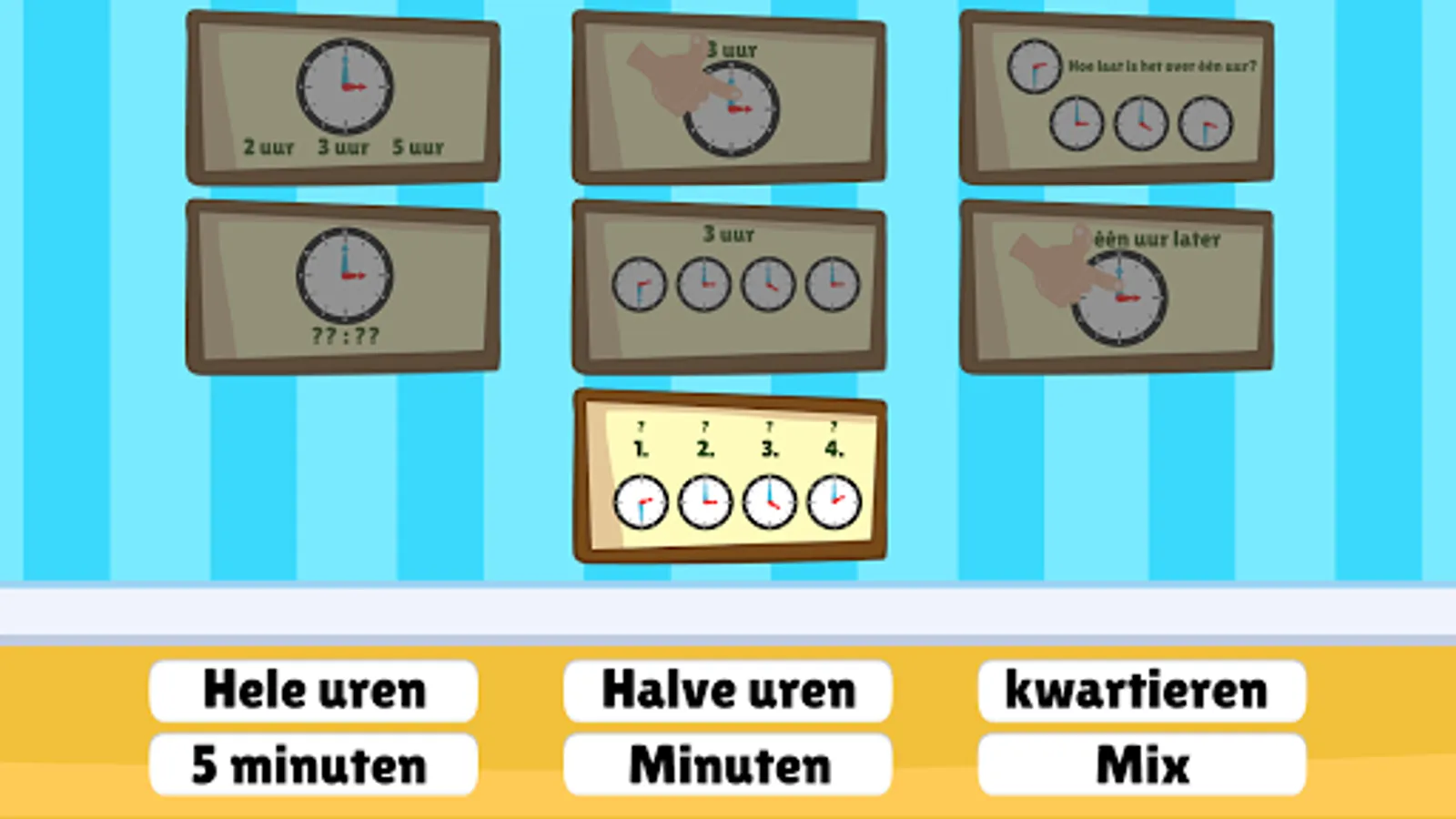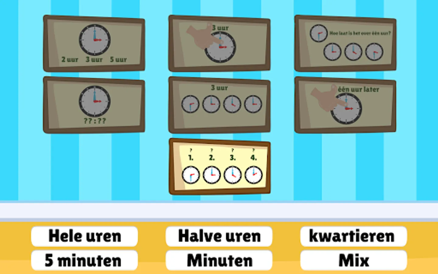 Use the app to find out what your child does and does not control (yet). Start practicing at the lowest level parts. First check whether your child can read the full and half hours and then the quarters. You can also choose to try “mix” with the exercises. Especially if you are almost sure that these first three parts of the clock are going well, the option “mix” is the fastest option to check this with your child.