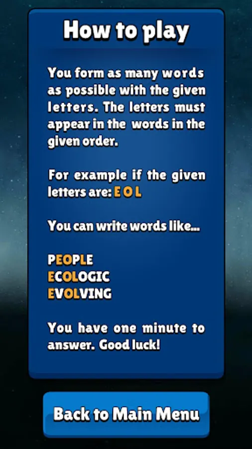 The game will give you one, two or three letter combinations. You form as many words as possible with the given letters. The letters must appear in the words in the given order. You have one minute to answer. Good luck!