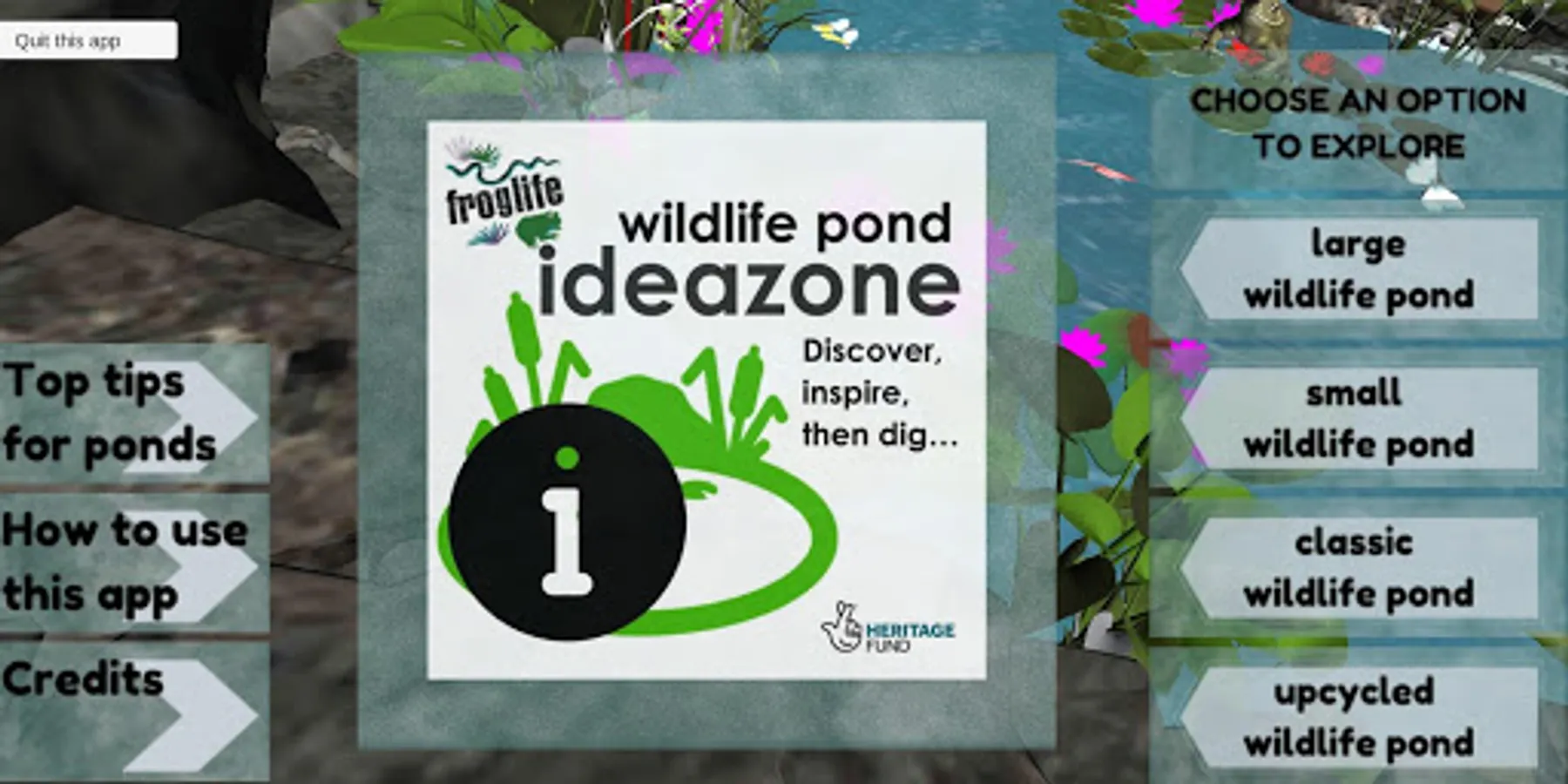 We want to inspire you on your wildlife pond journey! Discover four different wildlife pond designs and find out more about the animals that thrive and depend upon these important freshwater sources. Once inspired, get digging and tell us all about it! This simple educational app also features a 3D advice section detailing the eight steps to making wildlife ponds truly special. The app is funded by National Lottery Heritage Fund