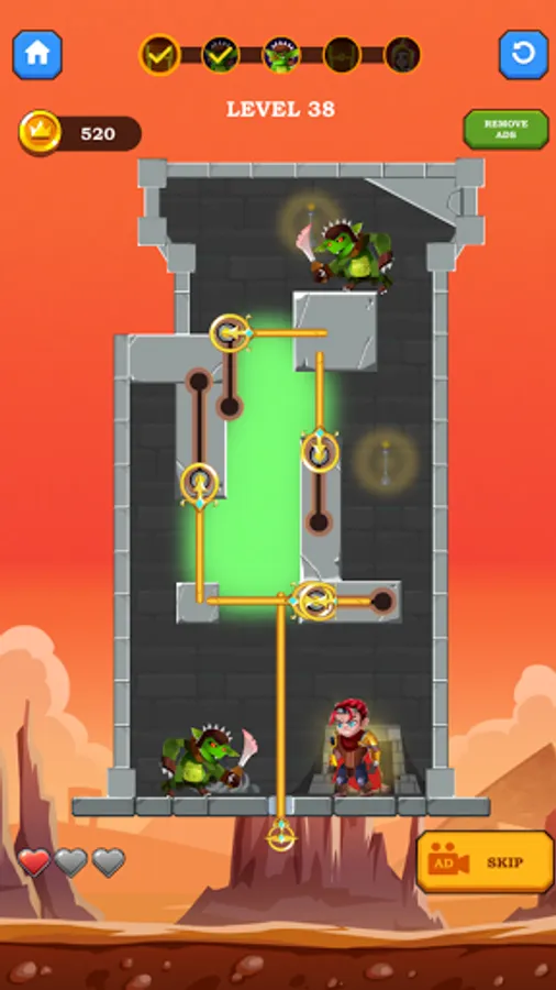 Solve puzzles and save the hero, collect all the treasures, kill the monster and save the princess. Shoot the pin and destroy your enemies by drawing lava and poison gas into their puzzle units. Cut the ropes to save the princess from the scary monster.