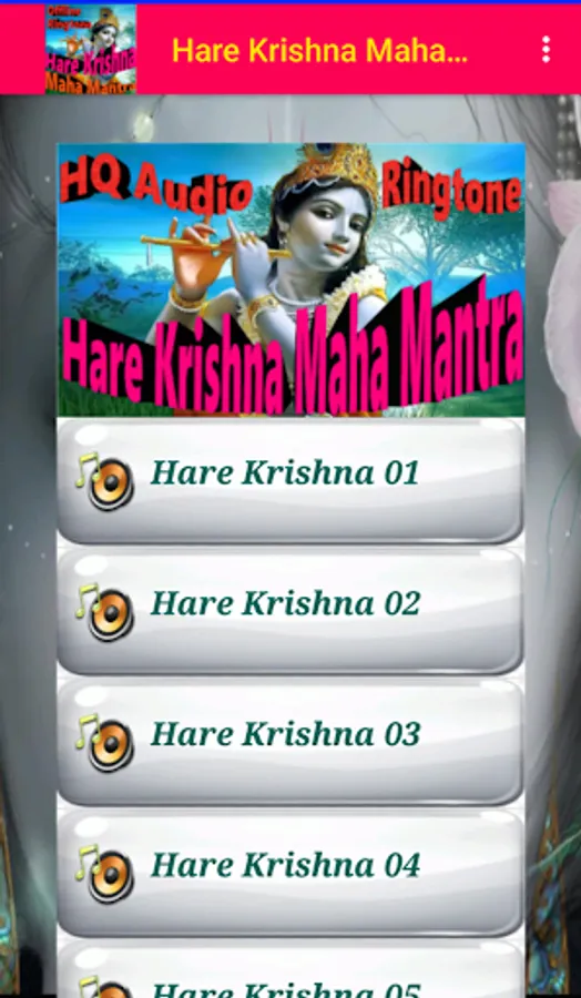 Hare Krishna Maha Mantra offers 12 best collection Dhun (Songs) of most known mantra, Hare Krishna Maha Mantra. Install and enjoy the magic of Hare Krisna Hare Rama Dhun in your Android Gadget. Enjoy the best of Hare Krishna Maha Mantra Songs in high quality offline audio with ringtone and play all feature.