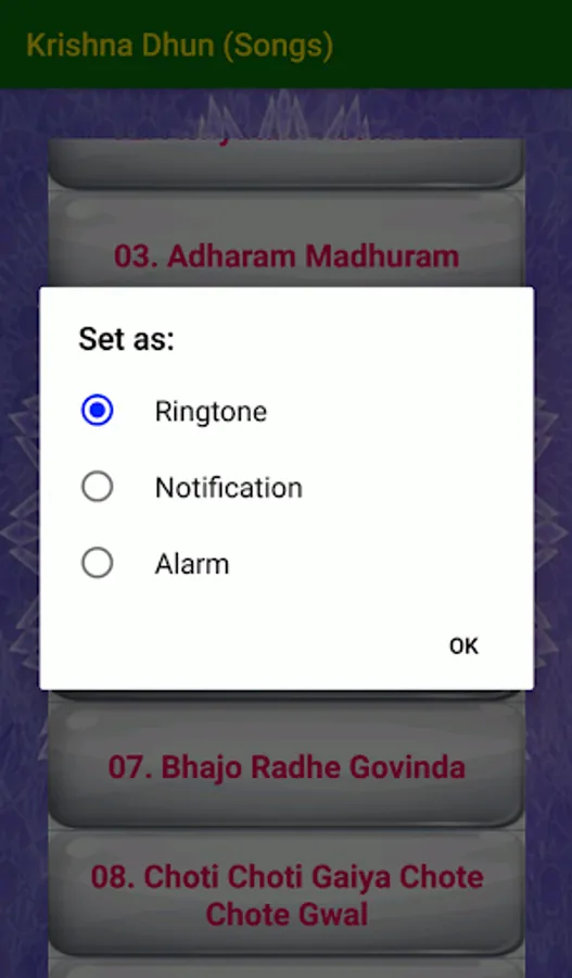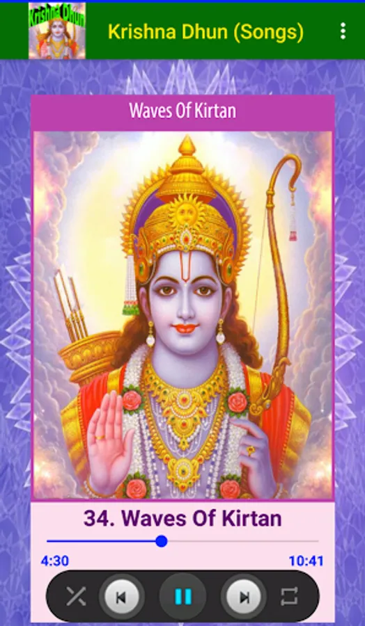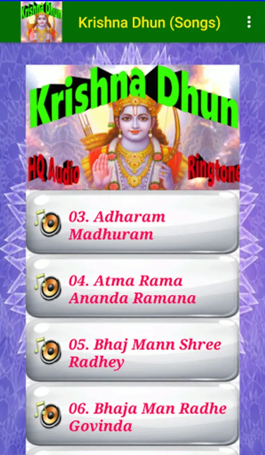 Krishna Dhun (Songs) offers 34 best collection of Lord Krishna themed Dhun (Songs). Install and enjoy the magic experience of Krishna Dhun in your Android Gadget. Enjoy the best of Krishna Dhun (Songs) in high quality offline audio with ringtone and play all feature. You can enjoy it anytime and anywhere.